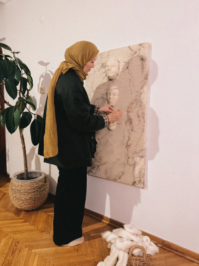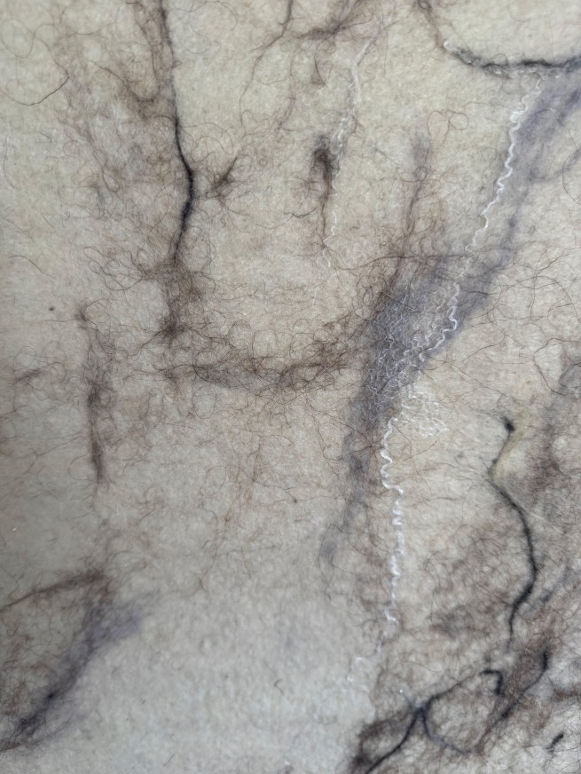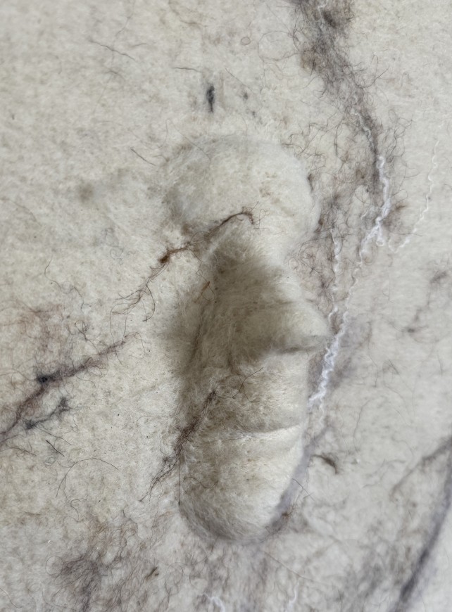 Geleneksel keçe yöntemi ile oluşturulan yüzey üstüne iğneli keçe ile oluşturulmuş yüz formları, 63×118 cm