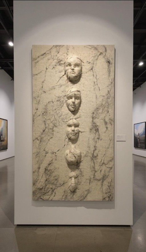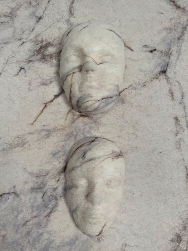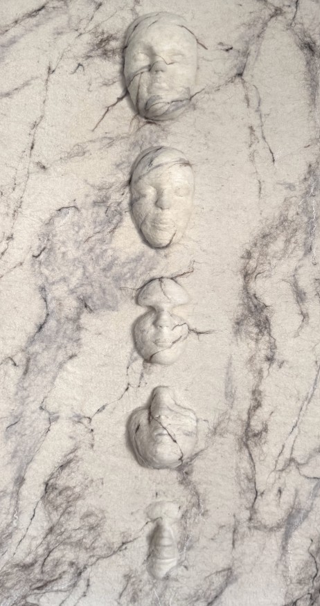 Face forms created with needle felting on a surface created using the traditional felting method, 63×118 cm