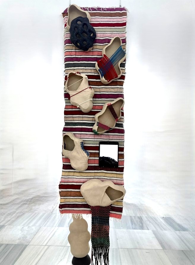 Seramik heykeller ve dokuma tekniği (asılı seramikler 25×50 cm, zemindeki seramik 25×70 cm, arka plan dokuma 70×210 cm)