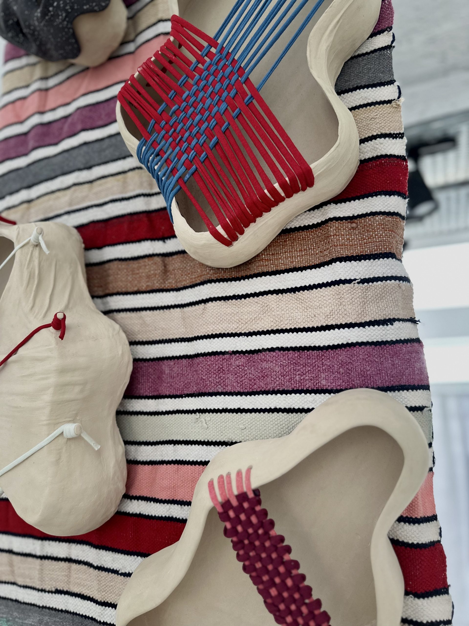 Ceramic sculptures and weaving technique ( hanging ceramics 25×50 cm, ceramic til 25×70 cm, background weaving 70×210 cm)