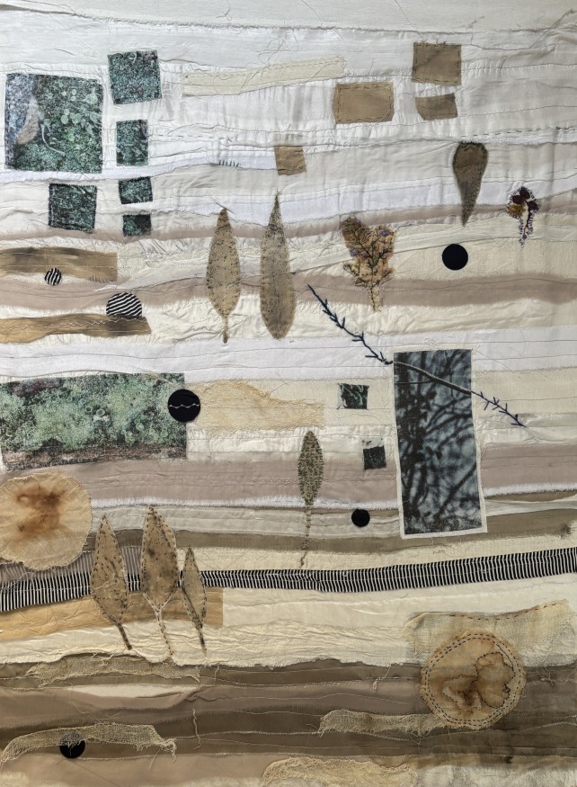 Fabric appliqué, eco printing, transfer printing, embroidery, natural dye (tea), 107×85 cm