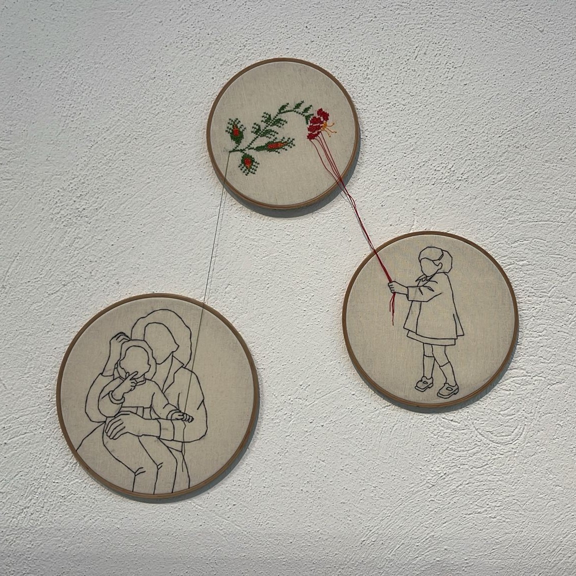 Since 2017, in her ongoing series “I was here / Buradaydım”, she reinterprets visuals from her childhood and her mother’s cross-stitch patterns on embroidery hoops. Through this act, she builds a bridge between past and present, making personal memory visible while also reflecting on a shared cultural heritage.