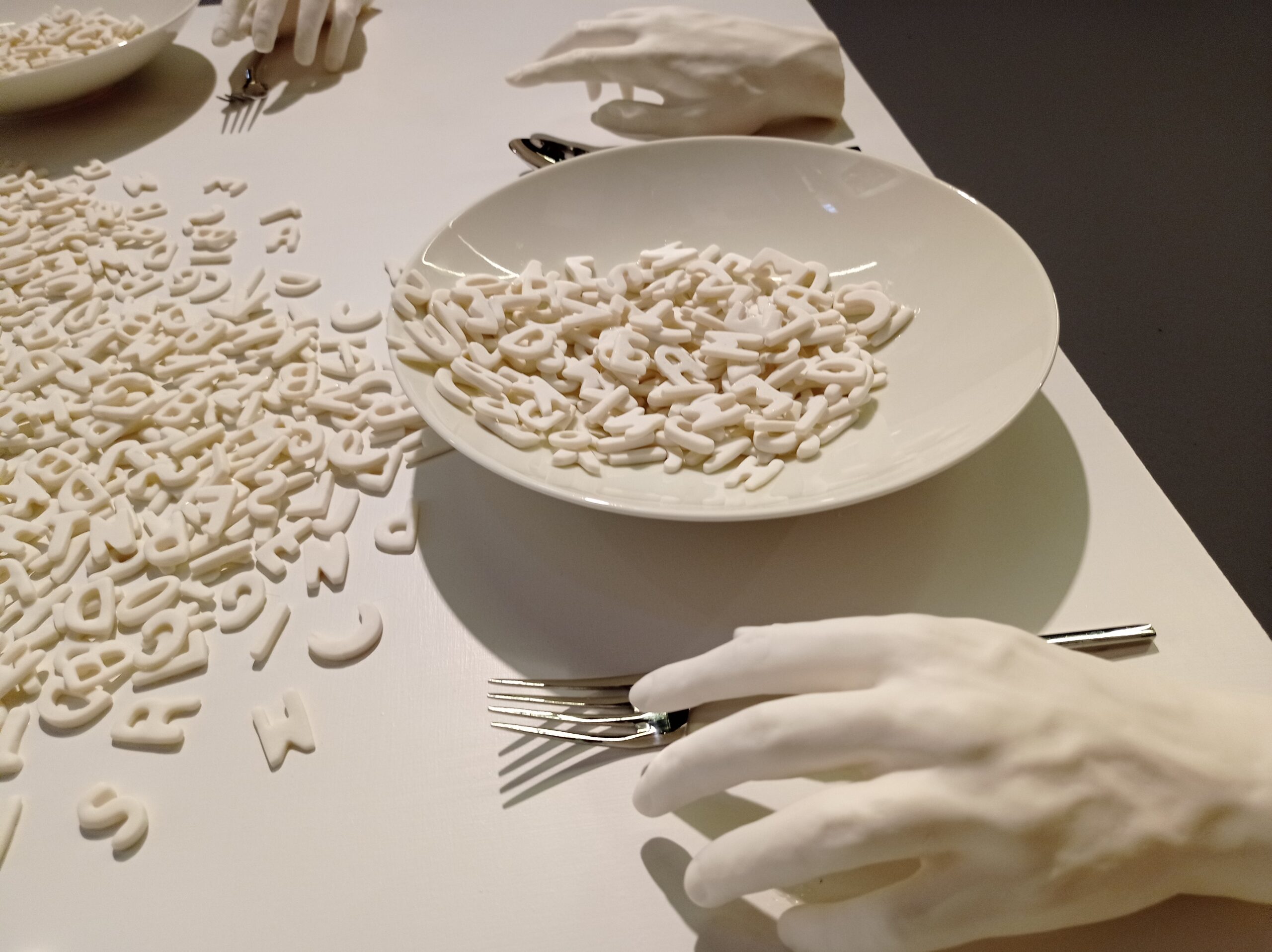 Yemek masası toplumların kültüründe sosyalleşmeyi ve iletişimi temsil eder. Kalabalıkların sofralarda buluşması yemek yeme ihtiyacının dışında aradaki bağın güçlendirilmesi kültürün devamı için önemli bir yerdedir. Mutlu anların ya da üzüntülerin paylaşıldığı yer de toplu kurulan sofralardır. Sofra araç gereçleri de gelenekselden moderne toplumların kültürlerine göre bir gelişim-değişim göstermektedir. Yalnız başına sofrada olmak keyifsizdir ve yemeğin de bir hazzı kalmaz. Öncelikle yemek ihtiyacı giderildikten sonra enerjisini kazanan insan sosyalleşme ihtiyacını da bilgi ve duygu aktarımıyla karşılamak ister. Sohbet sofranın ikinci önemli unsurudur. Dört kişilik bir çekirdek ailenin sofrasındaki iletişimi anlatan çalışmada yemek yerine harfler yer almaktadır. Günlük bir masa düzenine ait olan tabak, kaşık, çatal, bıçak kullanılmıştır. Herkesin masada eşit konuma, eşit öğüne ve eşit iletişime sahip olduğu sofra ideal çekirdek aileye bir göndermedir.