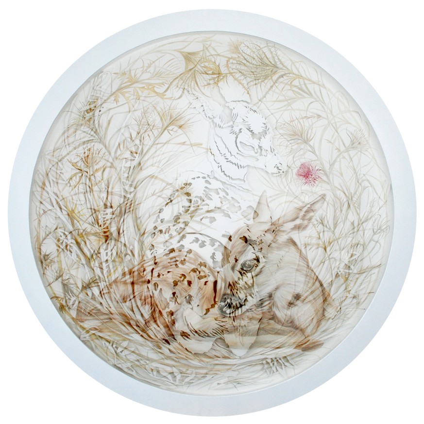 Oil painting on tulle on the front, mixed media on the back, 110 cm diameter x 9 cm dept