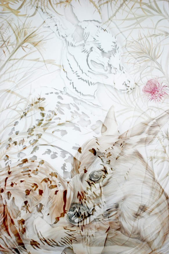 The transparent surface acts as a curtain between existence and non-existence; the animal figure sometimes becomes distinct, sometimes dissolves into the background. This visual transition implies the silent retreat of species and habitats.