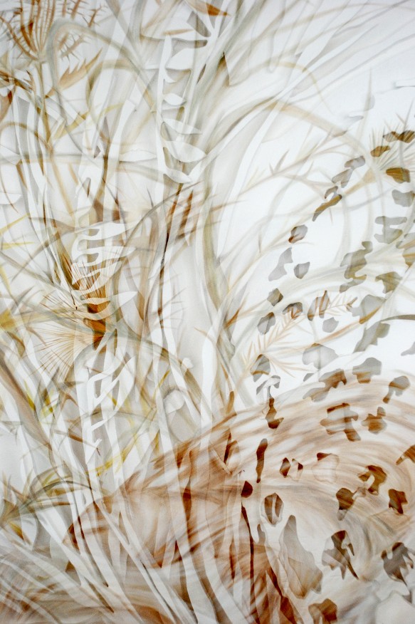 “Çorak Bahçe”, görünür olan ile silinmek üzere olan arasındaki kırılgan eşikte durur. Arka plandaki katmanlarda çoğalan ve üst üste binen bitkisel formlar, hafızasını yitirmekte olan bir habitatın izlerini taşır. Tül üzerine yağlıboya ile resmedilen hayvan figürü ise bu kırılgan dünyanın hem tanığı hem de son sakinidir.