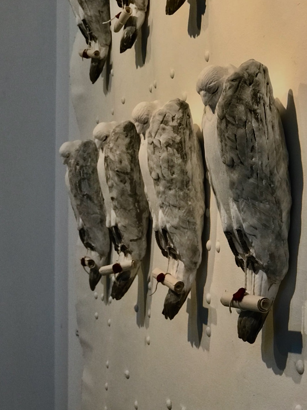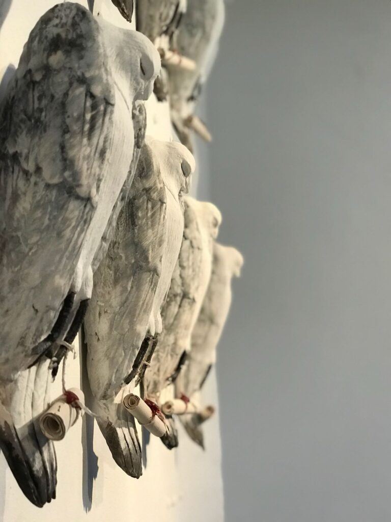Değersizleşen iletişim hakkımızı, eskiden haberleşme ağı olarak kullanılan posta güvercinleri olarak ele aldım. Posta güvercinleri haberi kaynağından alıp iletilecek mevkie iletmek amacıyla kullanılan bir yoldu. Yarı yolda yolu kesilen ve haberin alıcıya ulaşmasını engelleyen kişiler, güvercinleri etkisiz hale getiriyordu. Ulaşması gereken haber, alıcıya ulaşamadan ya durduruluyordu ya da haberin içeriği değiştirilip alıcıya tekrar uçması sağlanıyordu. Güvercinin, ayaklarındaki mührü ise açılmamış kapalı mektuplarla haberin ulaşamadığını ve güvercinlerin hareketsiz bırakılarak haberin kesin bir dille ulaşamayacağı duygunu vermek istedim. Güvercinlerin arkasından duvardan yere kadar uzanan bir şövale bezinin üzerine kör alfabesinden yazılar ekleyerek mesajın okunamadığını izleyiciye anlatmak istedim. İletişimin önemini belirten yazının okunamaması aslında manipülasyonu anlamadan, okuyamadan, belirsizlik içinde yaşamakla sürdürüleceğini ifade ediyor.