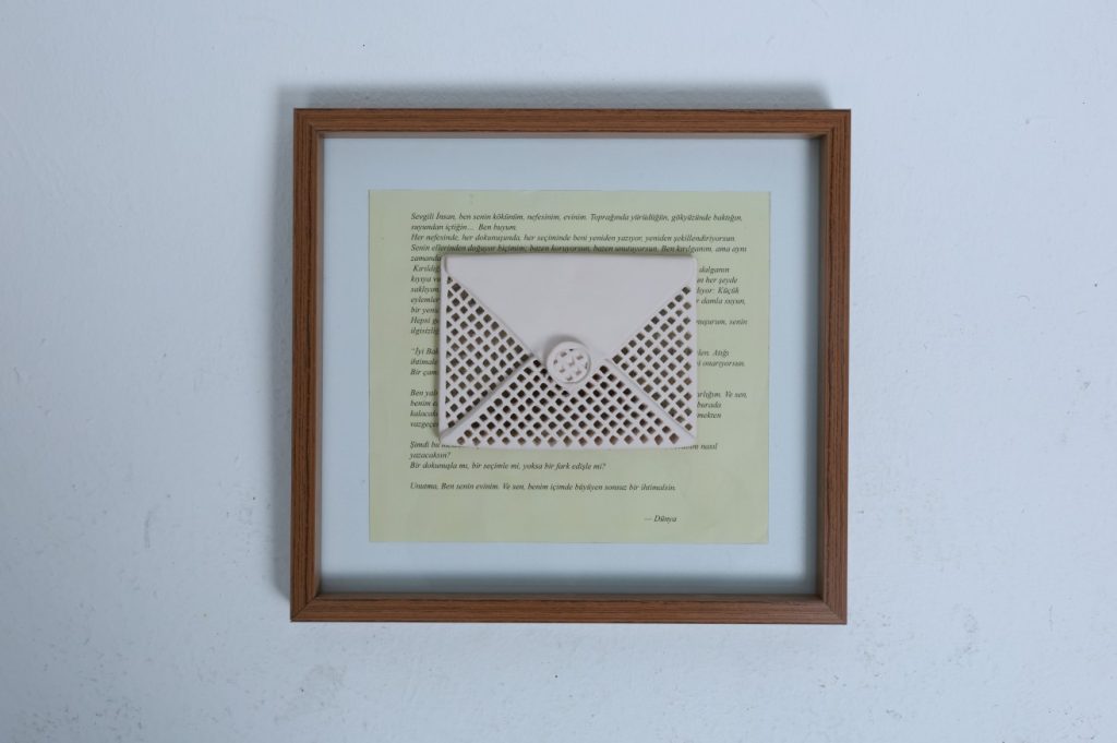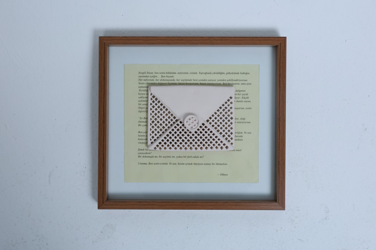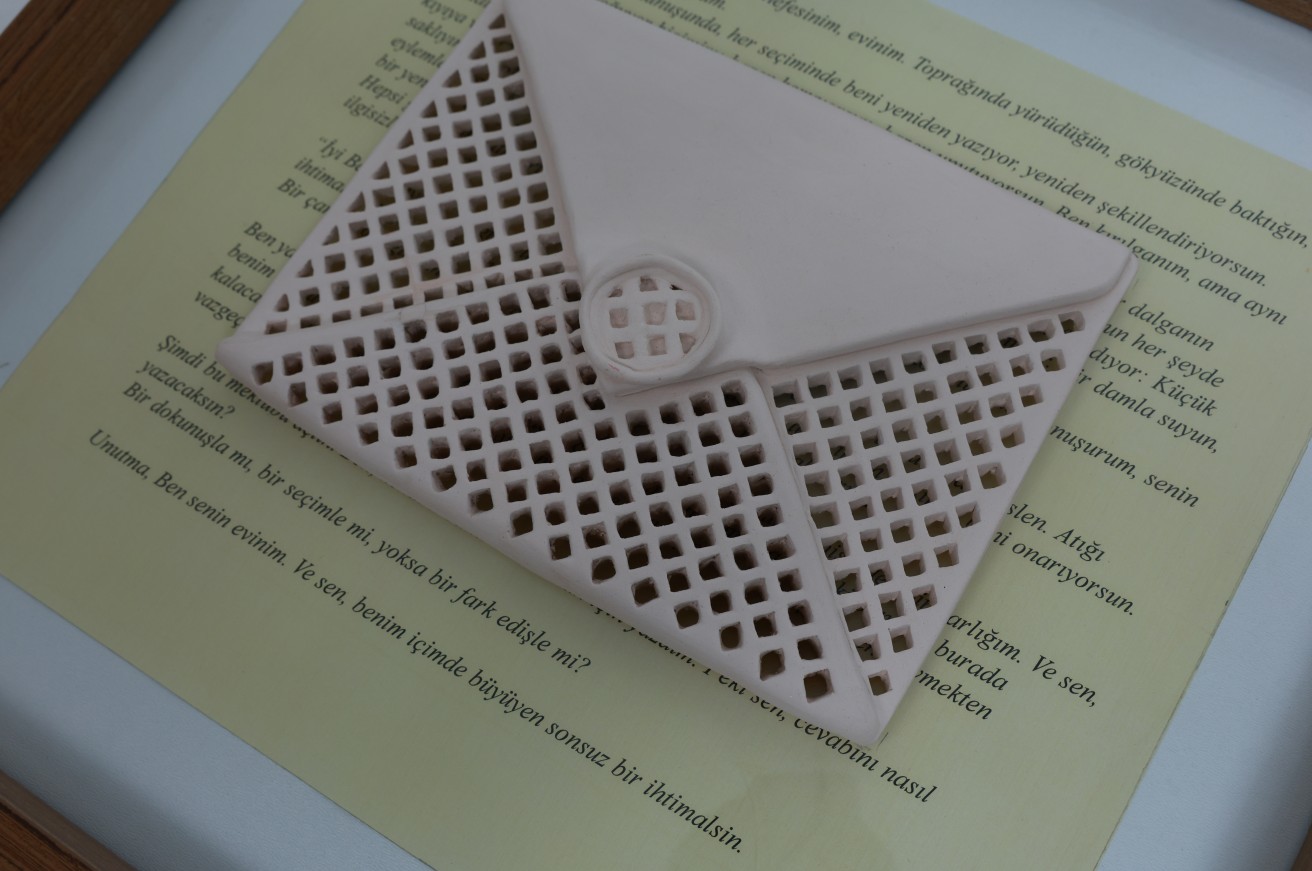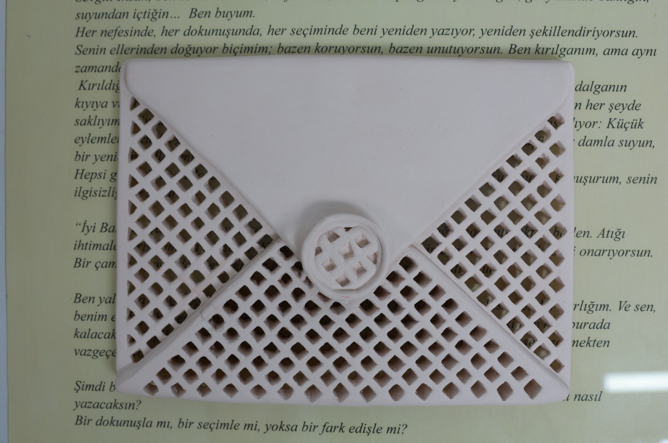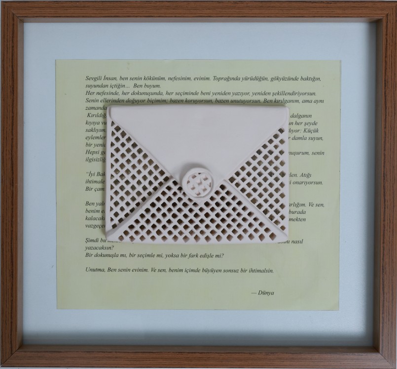 Mektup, bir mesaj, bir çağrı ve bir hatırlatmadır. “İyi Bak Dünyana” çağrısı da aslında bize gönderilen bir mektup gibidir. Ajur tekniğiyle şekillenen seramik zarf, görünür olanla gizli kalanı bir arada taşır. Boşluklar, farkına vardığımız gerçekleri; kapalı yüzeyler ise göz ardı ettiklerimizi temsil eder. Seramik zarfın topraktan yapılmış olması, bizi özümüze ve doğayla kurduğumuz köklü bağa geri çağırır. Bu eser, küçük eylemlerin birleşerek büyük değişimlere dönüşebileceğini hatırlatır. Boşluklardan sızan ışık, bireylerin atacağı adımları sembolize eder; kırılgan yapısı ise dünyanın aynı hassasiyetle korunması gerektiğini vurgular.