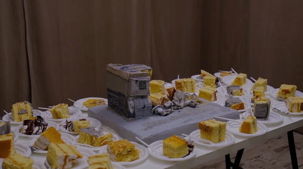 The video performance titled “The Times Before The Past” recreates a building in Nusaybin whose facade was riddled with bullets during the conflicts, in the form of a hyper-realistic cake. The artist transfers the physical and symbolic wounds of this structure to the exhibition space in a form that can be consumed by viewers during the performance. This consumable form also encourages reflection on the region’s rapidly changing circumstances and conditions. The cake form, by evoking the concepts of both sharing and destruction through consumption, makes visible the layers of violence that permeate everyday life.