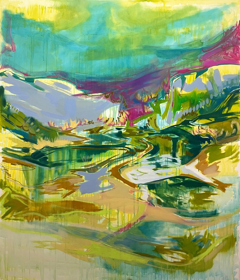 As in my previous works, this piece incorporates natural elements. The composition was developed through a series of sketches made during my visits and walks in a familiar landscape. With each new sketch, the forms became increasingly abstract, allowing visible reality to blend with my personal interpretation of it. The painting includes visual components that reference nature, such as wetlands, greenery, and dry soil. I created a horizon line by dividing the composition along a horizontal axis, making it easier for the viewer to distinguish between the sky and the ground. This work aims to present nature from a subjective point of view. Throughout the process, my main focus has been to allow the viewer to perceive the landscape in a way that echoes my own experience of it.