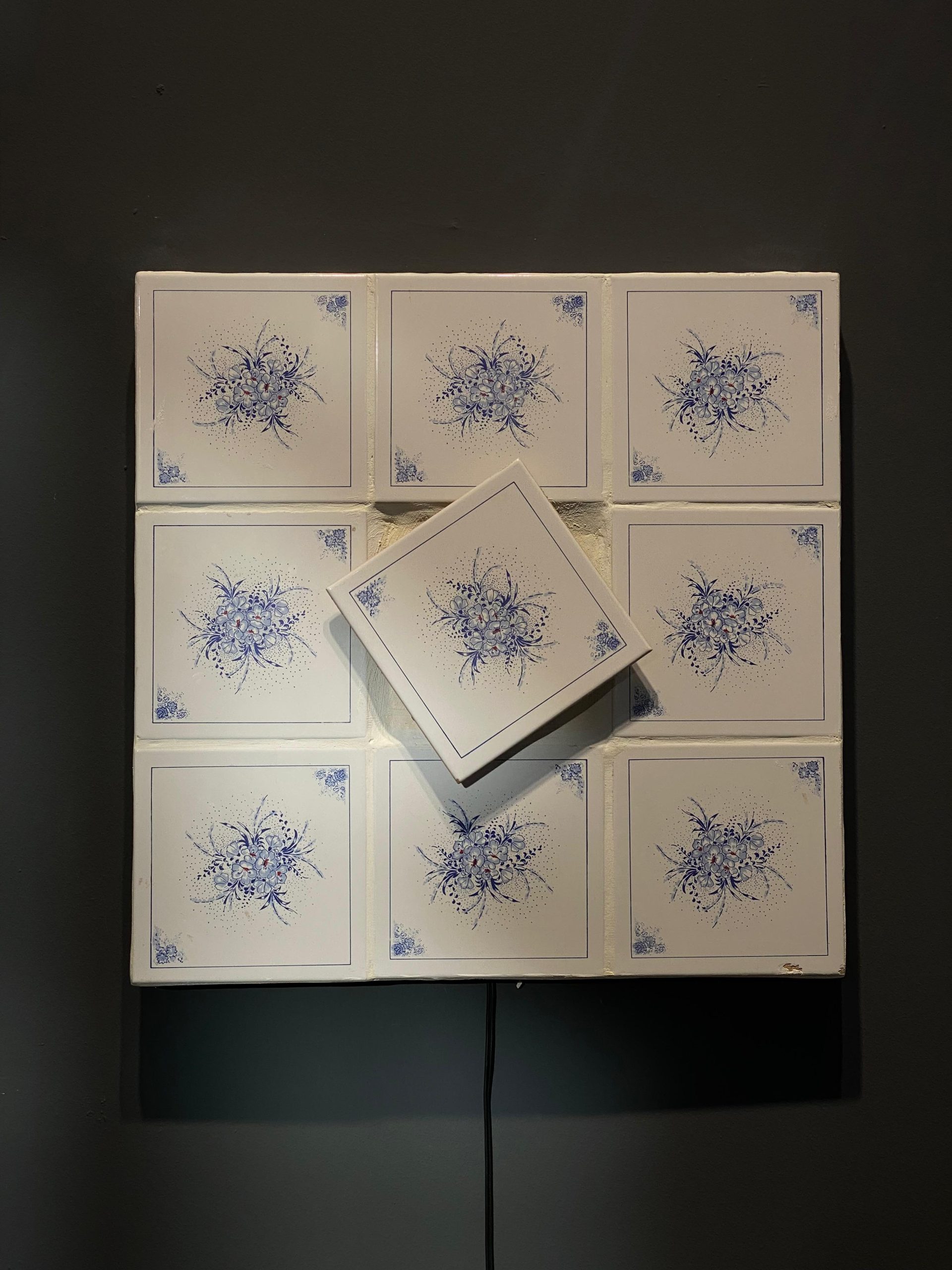 I mustn’t forget the delicious fruit-filled basket in the kitchen either. After the houses were demolished, I locked everything inside them in my mind. I retrieved them to reuse in every new piece I created. It was a kind of struggle. I wouldn’t give them what they tried to make me forget; I would remember. But the mind can play little tricks on you in this struggle. As I tried to keep all the memories of home in my memory, different houses and different tiles began to be added on top, and I began to forget the first tile. I was succumbing to time. Were the swans in the front or the back? Was there a door on the flat area behind the lake or not? As I thought about it, the shape and patterns of the tiles began to change in my mind.