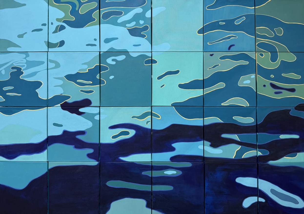 This study explores the optical refractions and the movement of light on the surface of water within a framework of formal continuity. The arrangement, consisting of twenty-four canvases, directly references swimming pool tiles, transforming each surface into a distinct fragment of reflection. While each part maintains its own internal dynamics, they collectively establish a fragmented sense of unity through their interrelations. Drawing inspiration from David Hockney’s experimental approach to his pool paintings, the composition foregrounds the concepts of rhythm, repetition, and continuity. Rather than depicting nature, the painting reconstructs the reflections of water as a spatial structure and a perceptual experience.