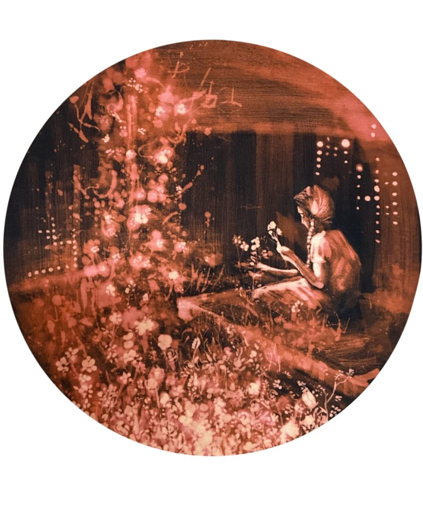 “From Within” explores a state of existence that flourishes alongside its surroundings. The figure is positioned among the plants, existing as a being that grows alongside them. The flower in its hand and the glowing forms around it represent a silently multiplying life energy.