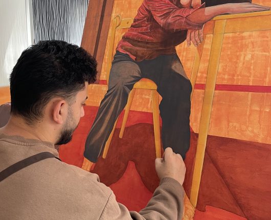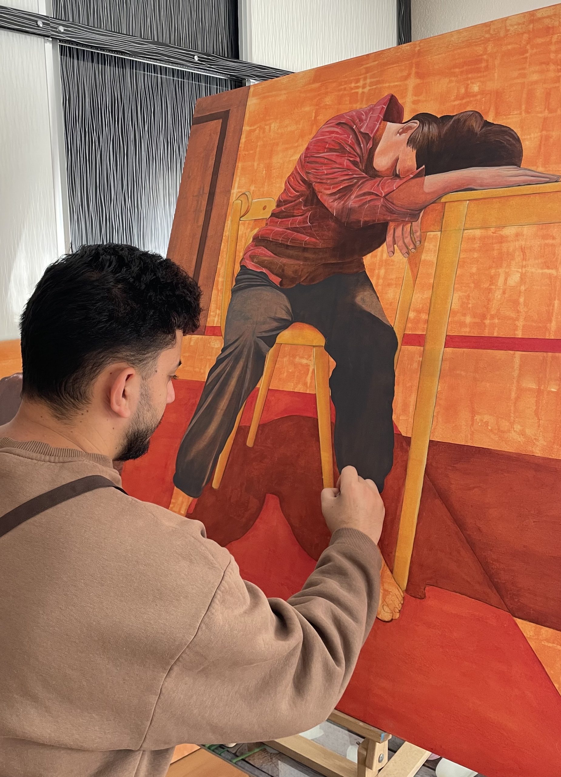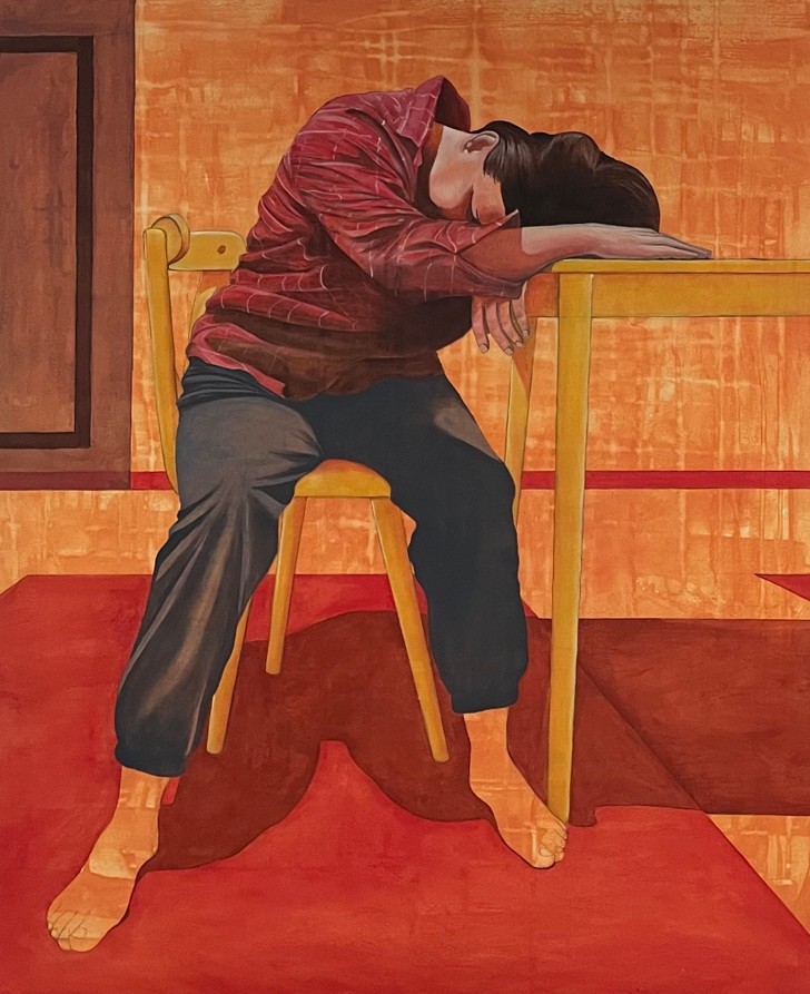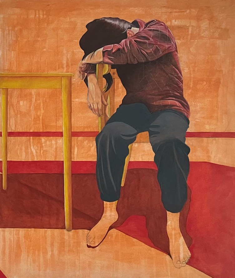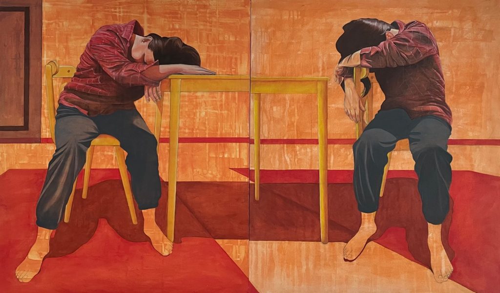 The work titled “Silence for Two” reflects and shows the loneliness of a person within himself and that his closest person is himself. The same figures in two different postures, positioned on both sides of the large table in the middle of space, reflect the contradiction and anxiety within the human being. The hard and uncomfortable wood on which the figures lean is a reference to the instability and discomfort of life. The harmonious warm colors used in the work and the red line connecting the two canvases also show the interconnectedness of the figures.