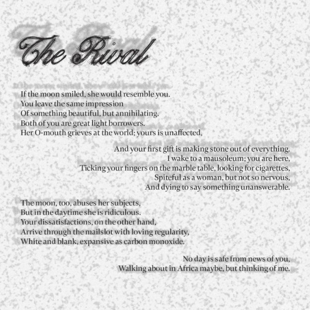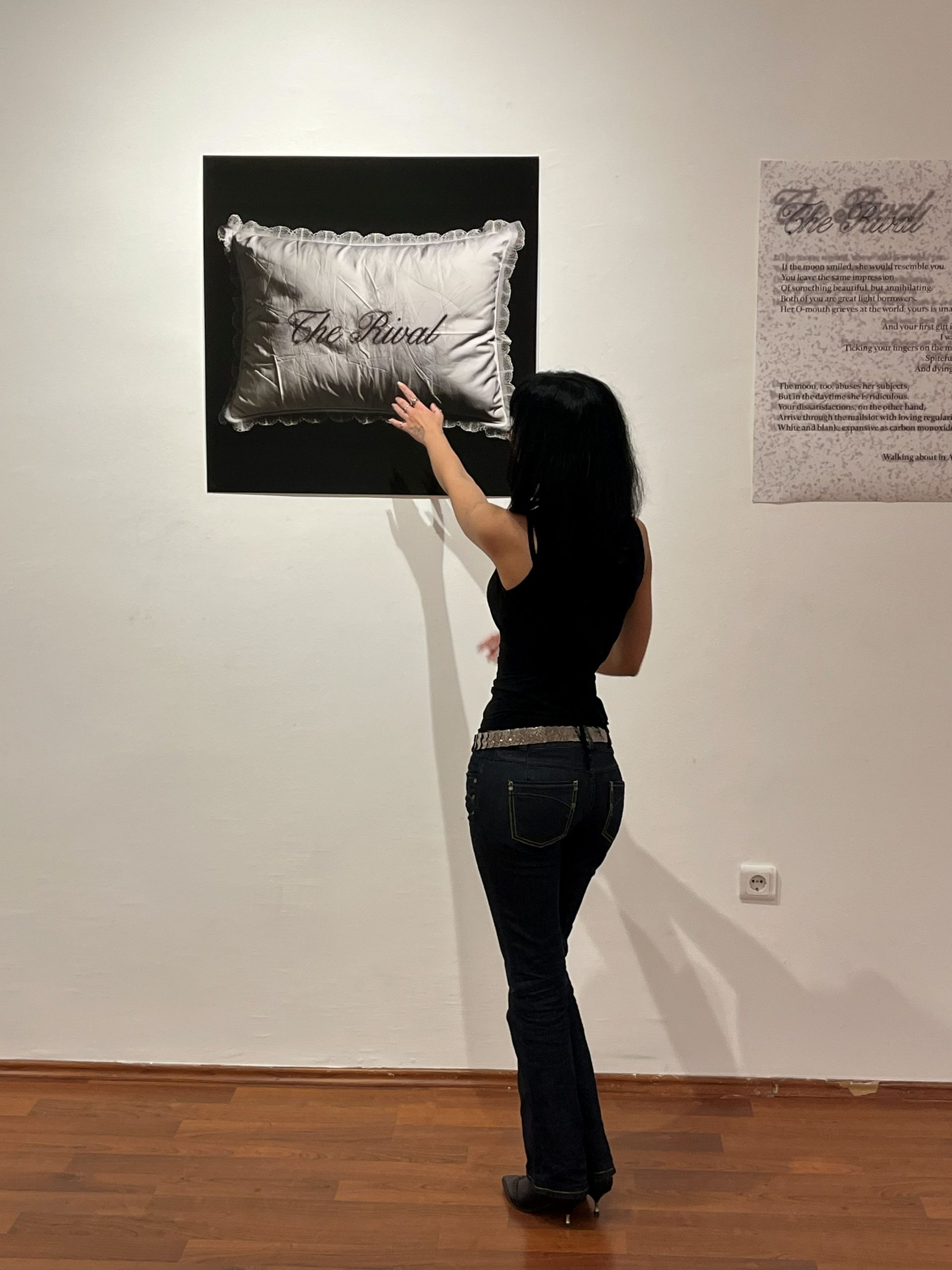 The Rival, Plath’in Ted Hughes’un ihanetini öğrendikten sonra yazdığı şiirlerden birine dayanır. Ham bir kadın öfkesinden doğan metin, dantel bir yastığa saç telleriyle işlenmiştir. Ev içi çağrışım ile fiziksel varlık birleşerek şiirin duygusal şiddetini görsel ve dokunsal düzlemde yeniden kurar.
