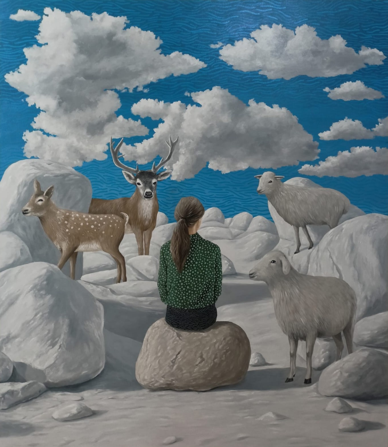 In my paintings, nature is not a landscape; it is a place of internal memory, one that humans reject but can never fully sever. Structures built on stone hold the fragile balance of rootedness and the desire for refuge, while animal figures emerge as intuitive echoes of the repressed natural self. Timeless and empty spaces are thresholds where identity dissolves, belonging blurs, and new existential questions emerge. In this visual plane, the viewer is not merely an observer; he or she is an active witness, invited to recall their lost roots, their connection to nature, and their own inner selves.