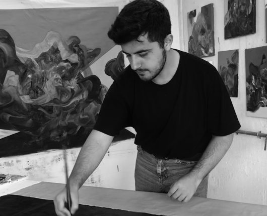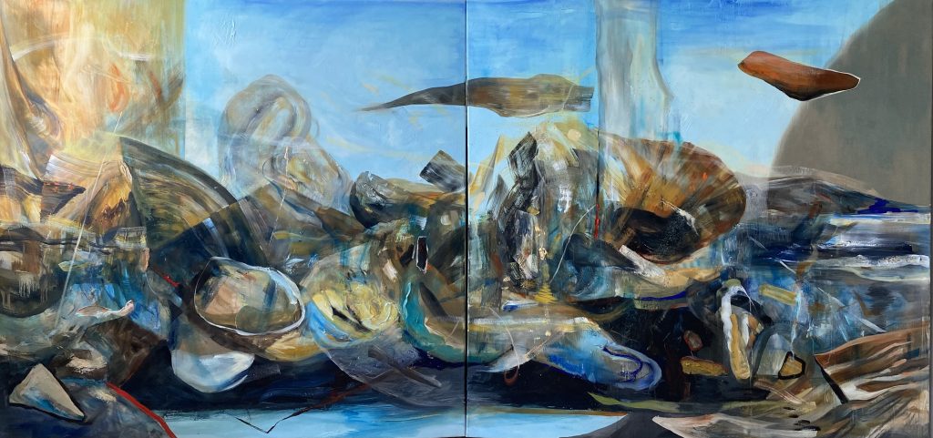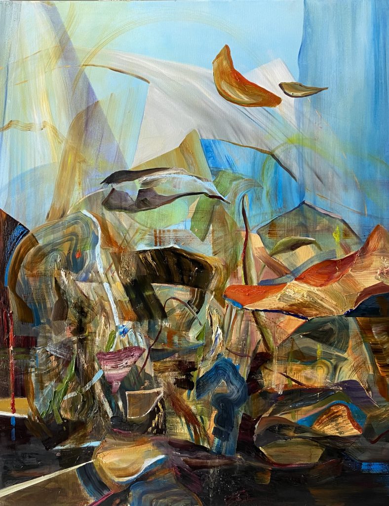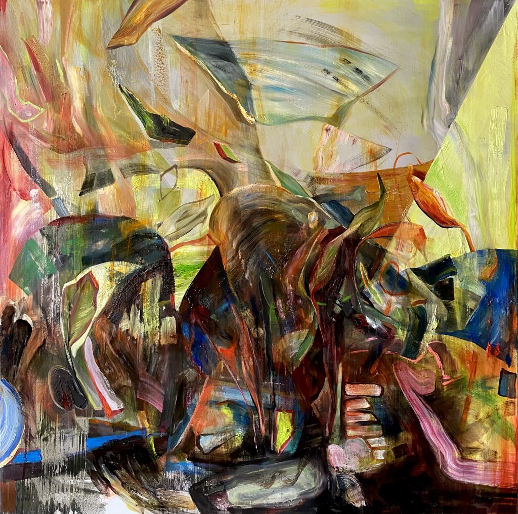 “Untitled” focuses on the concept of “adaptation,” which is inevitable in the wake of the environmental, political, and cultural changes humanity is experiencing. The work is a highly abstracted landscape proposal, structured around the destructive element that is necessary for change. The end of meaning (change) and its reconstruction (adaptation) are represented on the picture surface by the ambiguous organization of organic and geometric forms. There is an infinite starting and ending point that the viewer can refer to in their dialogue with the work. The reason for this is the boundless nature of the material ecosystem designed by humans, exposed to countless losses and new data, parallel to the era they live in.