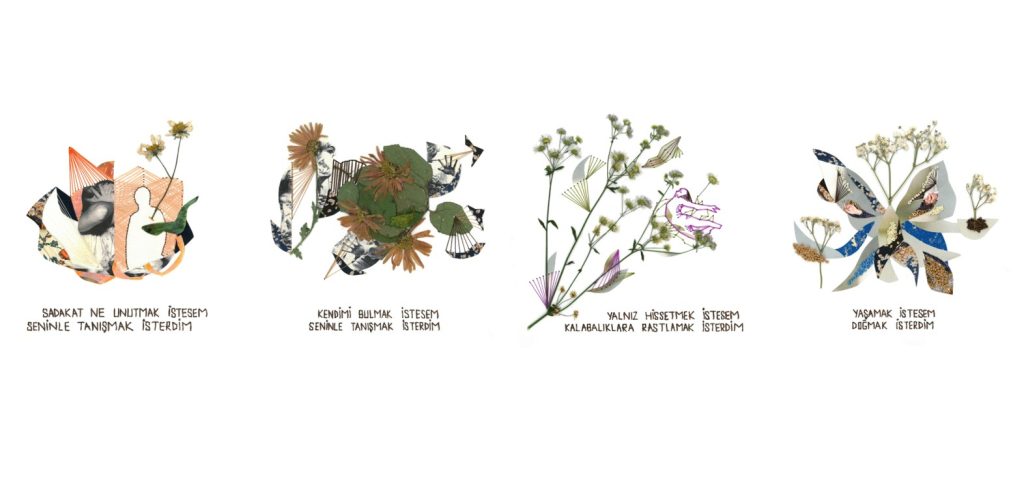 The interplay of mixed techniques such as collage, stitching, dried plants, and typography presents a layered sequence of emotions that are both fragile and resilient. Stitch marks function not only formally but also conceptually; they frame voids or bind dissonant feelings together. Dried flowers, in turn, refer to faded emotions and carry traces of memories transformed over time.