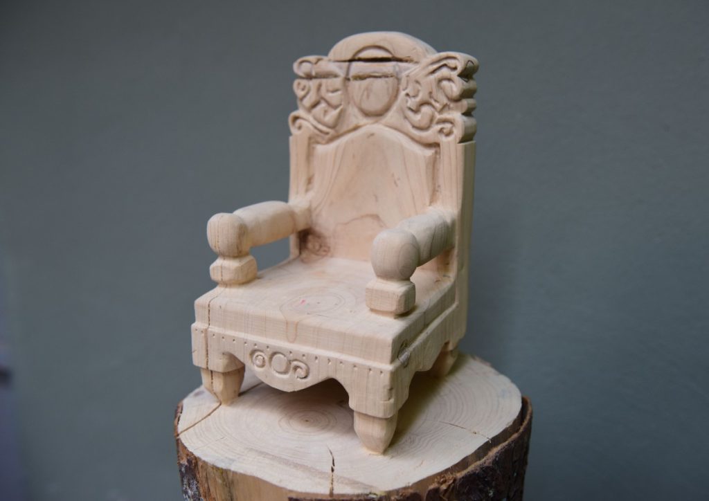 I use armchairs in my sculptures as they are among the best objects that reflect power. The first sculpture in the series, “Wings of Silver,” was carved from a single piece of raw cypress. The length of its base references the exaltation of power.