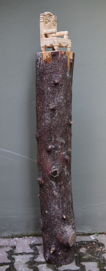 Koltuk, iktidarı en iyi yansıtan objelerden biri olduğu için heykellerimde kullanıyorum. Serinin ilk heykeli “Kanatları Gümüş”, tek parçadan ham bir servi ağacından oyularak çıkarılmıştır. Kaidesinin uzunluğu iktidarın yüceltilmesine atıfta bulunmaktadır.