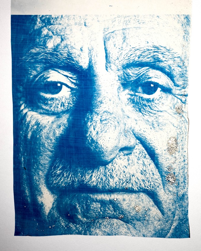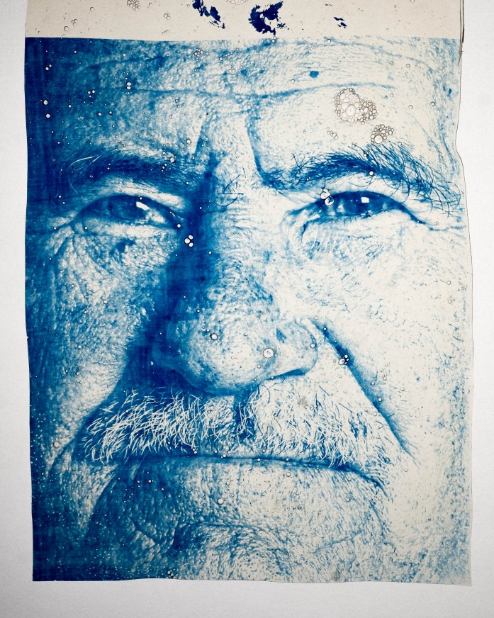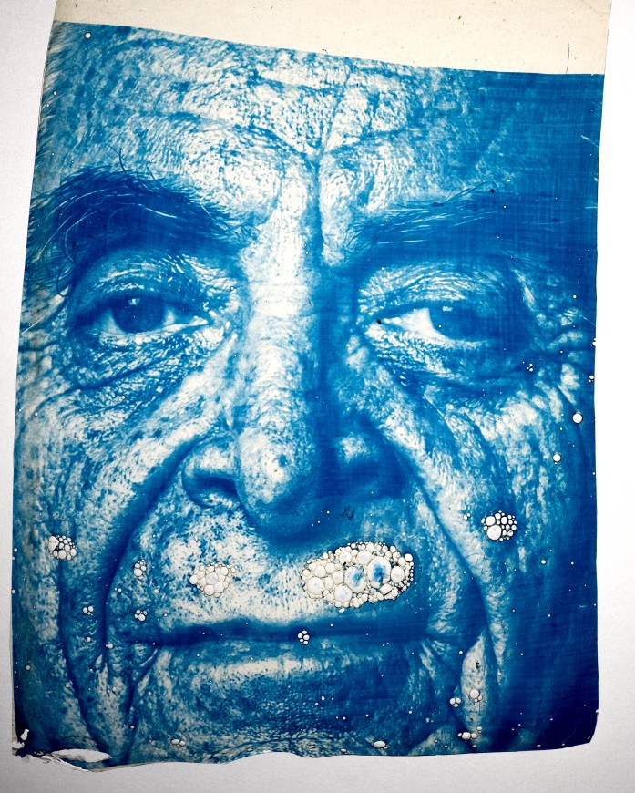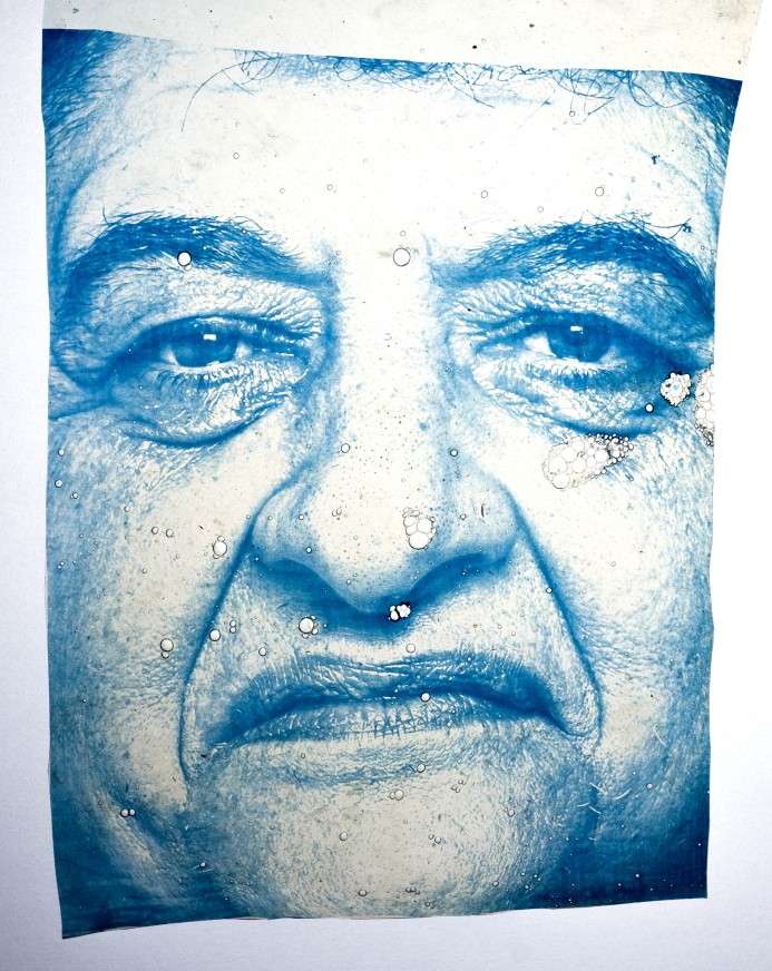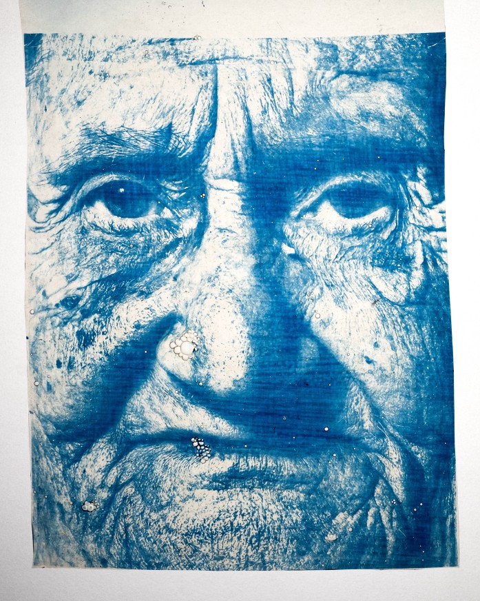 Cyanotype is an old printing method, far from digital technologies, which fits the spirit of these generations. The way the material breaks or changes also becomes part of the visual story.