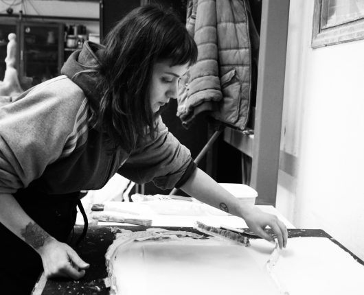 The work reflects the tension between the presence and absence of the body, conceiving the human form as a thin layer of “skin” stretched across a two-dimensional plane. While evoking the transience brought by time, it also questions the inherent tension and transformative nature of the material itself. Sensitive to physical conditions, wax alludes to the relationship between body and skin. As the surface that envelops the body and mediates its contact with the world, skin becomes a fragile threshold. The metal plate, with its sharp edges and slender form, not only serves as a base for this delicate and temporary existence but also introduces an element of tension and threat. Through this interplay, the work invites reflection on the transient relations established within space and the new dialogues formed between contrasting materials.
