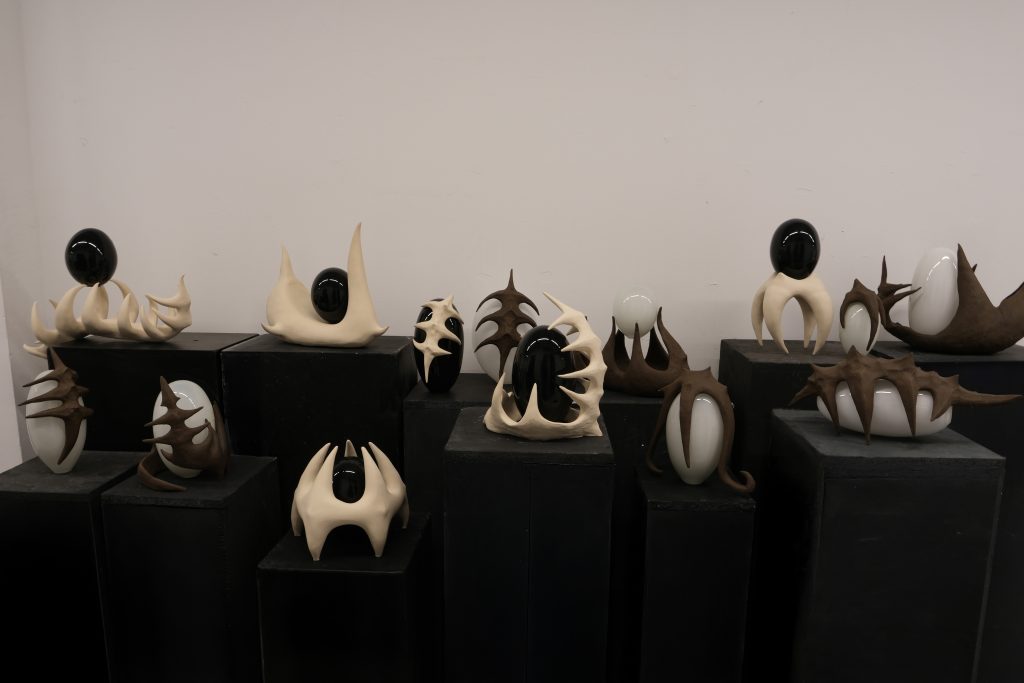Seride cam ve seramik ile ruh ve beden arasındaki sürekli dönüşüm halini anlatıyorum. Seramik formlar omurgayı, cam ise ruhu temsil ediyor. İki malzeme birbirini sarıp sarmalıyor. Bu etkileşimi, ne olduğunu bulma yolculuğundan bir an ve kendini oluşturmaya çalışan bir benliğin çabası olarak görüyorum. “Kucaklaşma”, ruh ve bedenin birbirini evriltmeye çalıştığı anları temsil ediyor.