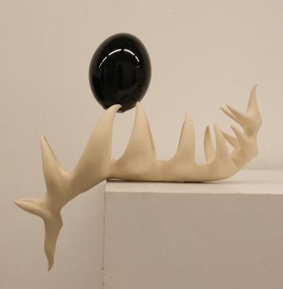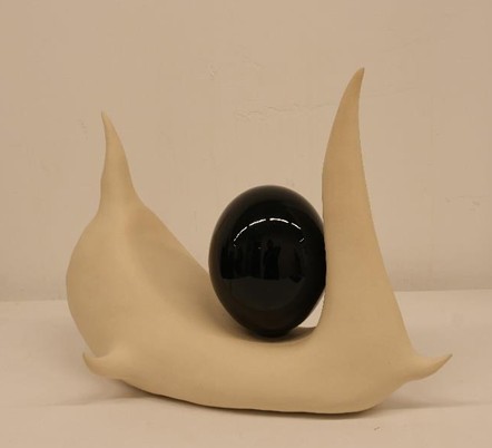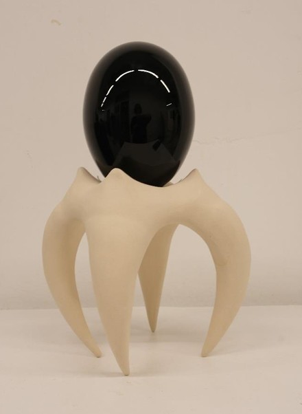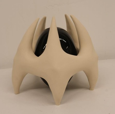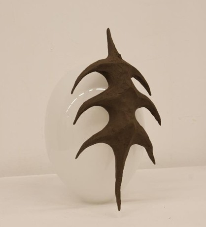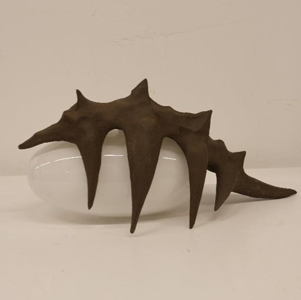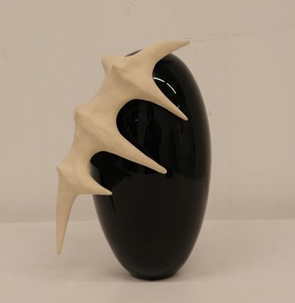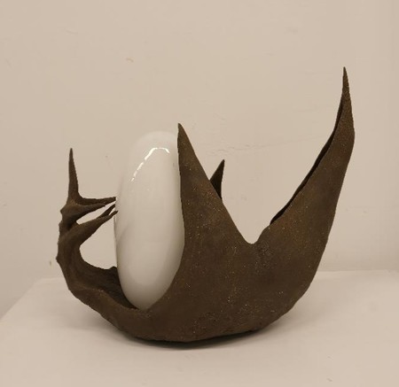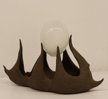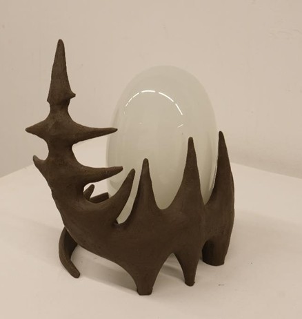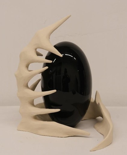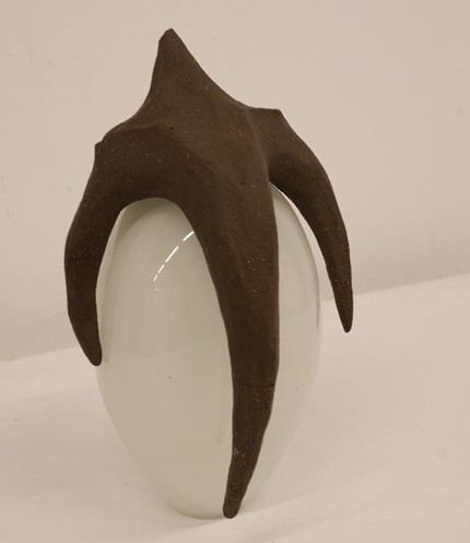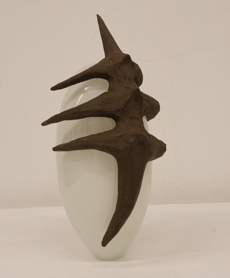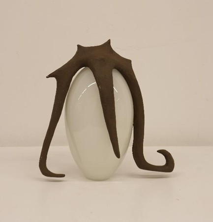 In this series, I explore the constant transformation between spirit and body through glass and ceramics. Ceramic forms represent the spine, while glass symbolises the spirit. These two materials intertwine and envelop each other. I see this interaction as a moment in the journey of self-discovery and the effort of a self striving to form itself. “The Embrace” represents the moments when spirit and body strive to transform each other.