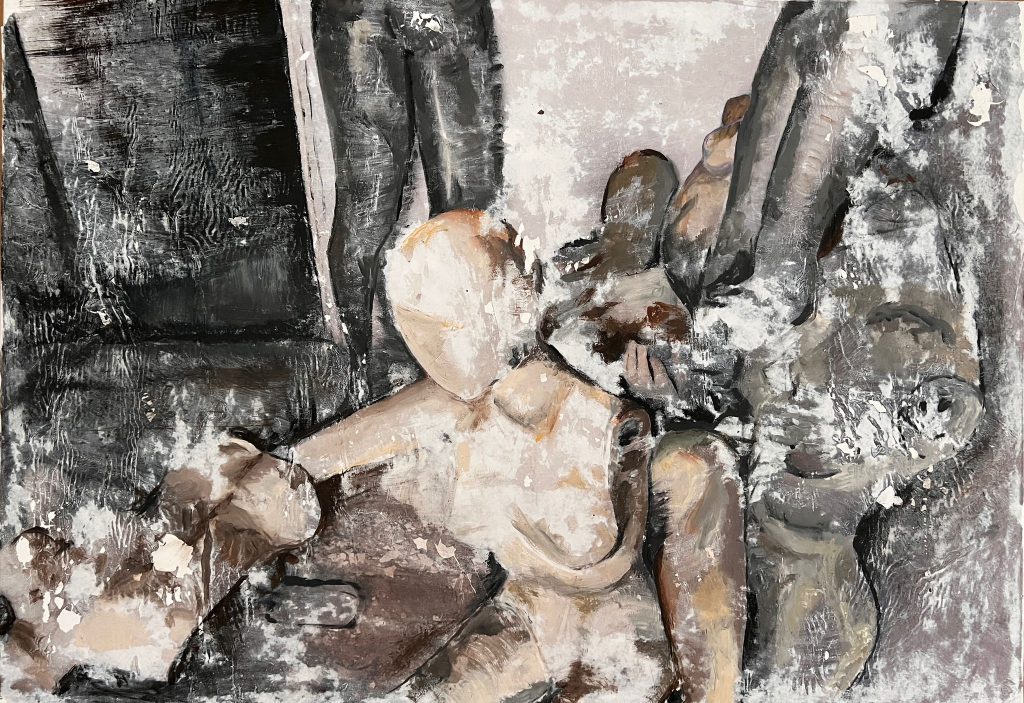 Kimliksiz bedenler, transfer yüzeyinin aşınmışlığı ve kazıma izleriyle silikleşir; akrilik müdahalelerle parçalanmış bir hafıza alanına dönüşür. Figürler, birbirine değmeden bir aradalığın içinde kaybolur. “Kütleler”, görünür olanın içindeki görünmezliği; kalabalık içindeki yalnızlığı beden ve yüzey ilişkisi üzerinden sorgular.