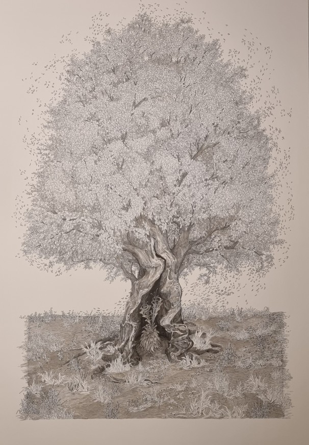 Birçok inanç sisteminde bahsi geçen “kutsal ağaç” kavramı üzerinde düşünerek ve birçok farklı kaynaktan yararlanarak üretmeye başladığım “kutsal ağaçlar serisi”; bir ağacın varlığının bir insanın varlığına nasıl atfedildiği ve dünyayla arasındaki organik ve düşünsel varoluşun üzerine düşünülerek üretilmiş bir seri resimdir. Bazen kimlikli, bazen de kimliği belli olmayan ağaçlar, her resimde yalnız ve yüce görüntüsüyle karşımıza çıkar. Karşılaştıklarında seyirciyle baş başa kalan ağaç, ilk bakışta sadece bir ağaçtır. Bir sonraki arayış onun kutsallığı üzerine olmalıdır.