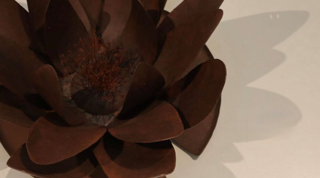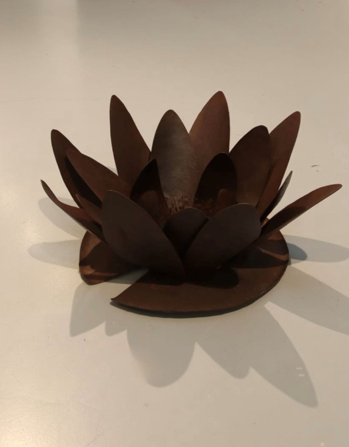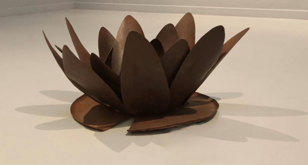 “Lotus” is a reinterpretation of a form traditionally associated with purity and cleanliness. The weight of the metal and its rusted surface detach the flower from its conventional meaning. The corruption of something expected to be pure points to a collapse—both physical and symbolic.
