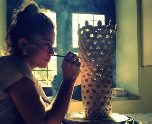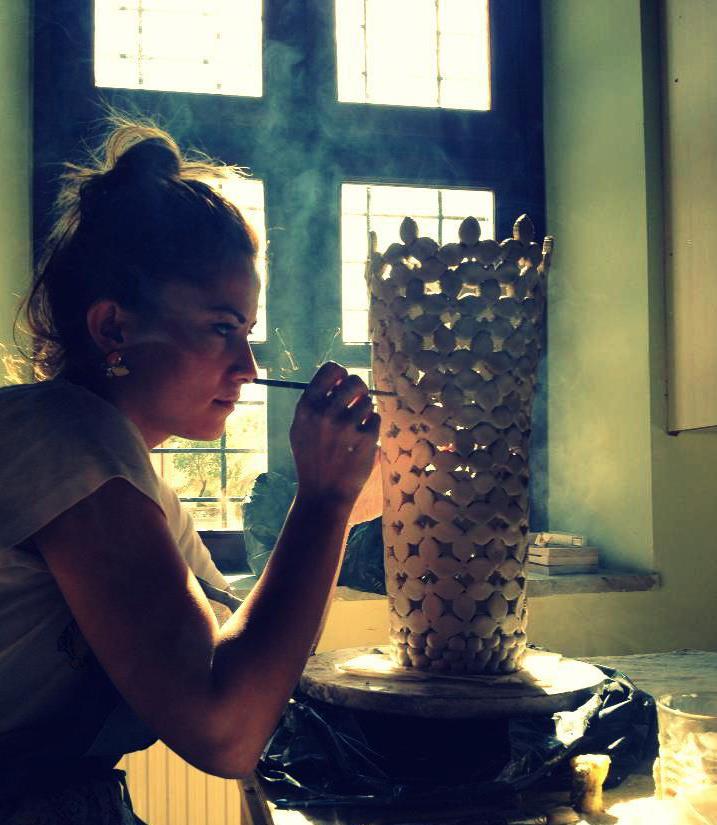 Earthenware plastik çamur, elle şekillendirme, artistik sır 1050°C, transfer baskı tekniği, ahşap malzeme, yerleştirme, 41×26 cm, seramik küp 4×4 cm
