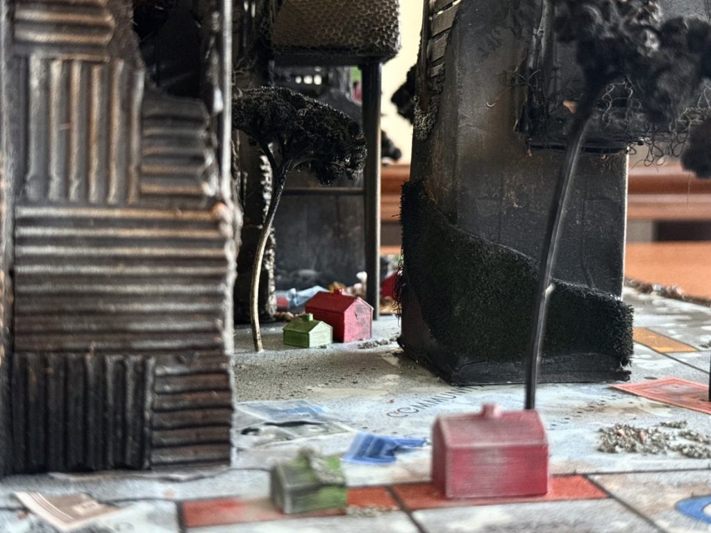 Oyuna herkes eşit başlar ve bir kişi hariç herkes iflas edene kadar oyun devam eder. Binalar büyürken yalnızca bireyler değil, birbirine bağlı sistemler, sesler ve izler küçülür; günden güne tükenir. Binalar teker teker yanarken oyun devam eder. Tüm binalar yanıp tüm kaynaklar tükenince oyun biter. Galip gelen, aslında hep birlikte kaybedilen bir düzenin zaferini kutlar. Kartlar toplanır, piyonlar başlangıca getirilir. Ve oyun her gün tekrar başlar.