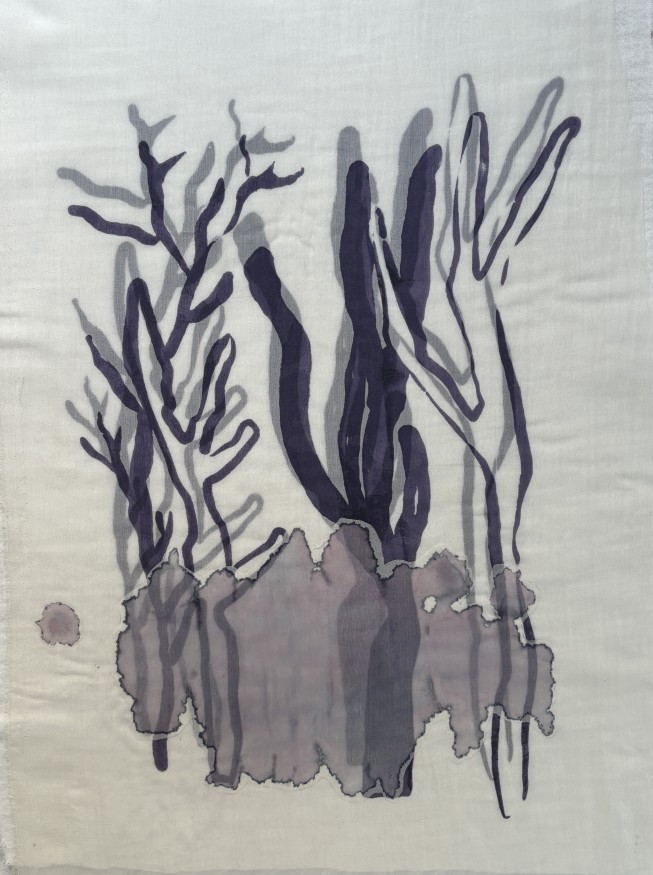 This three-part series takes its starting point from the echo of trees and forests. The forms in the works carry a quiet resonance of the vibrations found in nature, as lines, trunks, and shadows intertwine and multiply. The finely textured fabric surfaces evoke the permeability and fragility of nature; when the layers overlap, different intensities emerge with the light, and this transparency reflects the sense of depth within the forest. The colors—shades of purple and pink—suggest both the coolness of shadows and the continuity of plant life, while also evoking an imagined landscape. The dispersion of dye across the fabric reveals the slow flow and unrestrained beauty of natural processes. The Resonus series approaches the interaction between nature and matter as a vibration felt within silence, with each piece carrying its own inner echo while together implying the breath of a forest.