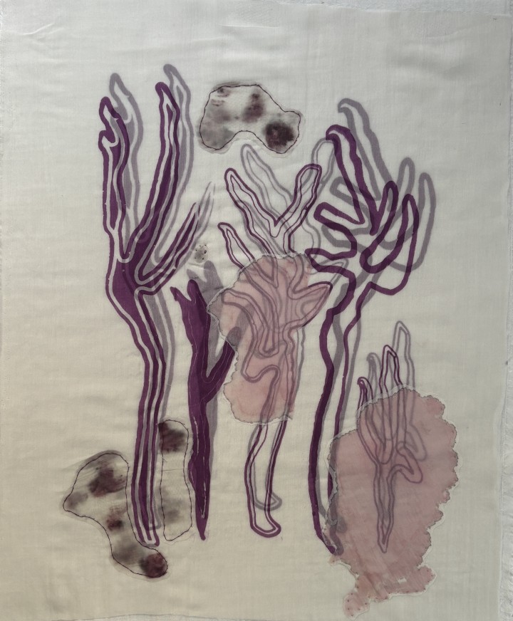 This three-part series takes its starting point from the echo of trees and forests. The forms in the works carry a quiet resonance of the vibrations found in nature, as lines, trunks, and shadows intertwine and multiply. The finely textured fabric surfaces evoke the permeability and fragility of nature; when the layers overlap, different intensities emerge with the light, and this transparency reflects the sense of depth within the forest. The colors—shades of purple and pink—suggest both the coolness of shadows and the continuity of plant life, while also evoking an imagined landscape. The dispersion of dye across the fabric reveals the slow flow and unrestrained beauty of natural processes. The Resonus series approaches the interaction between nature and matter as a vibration felt within silence, with each piece carrying its own inner echo while together implying the breath of a forest.