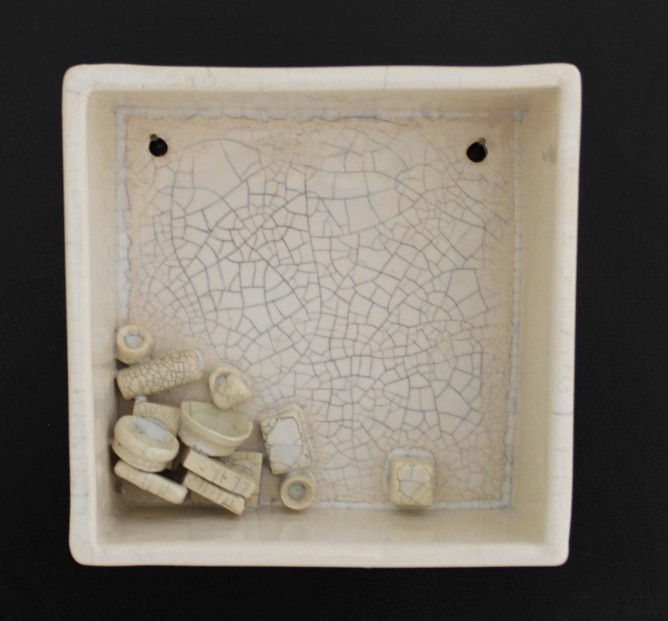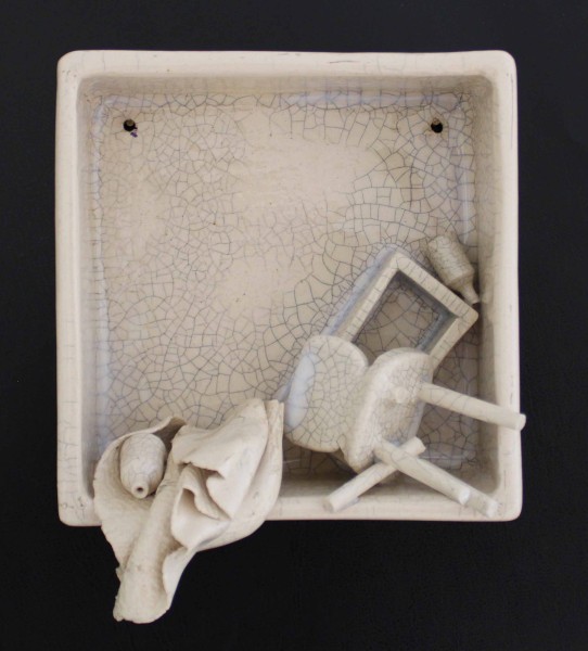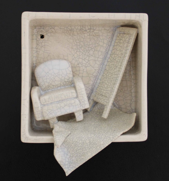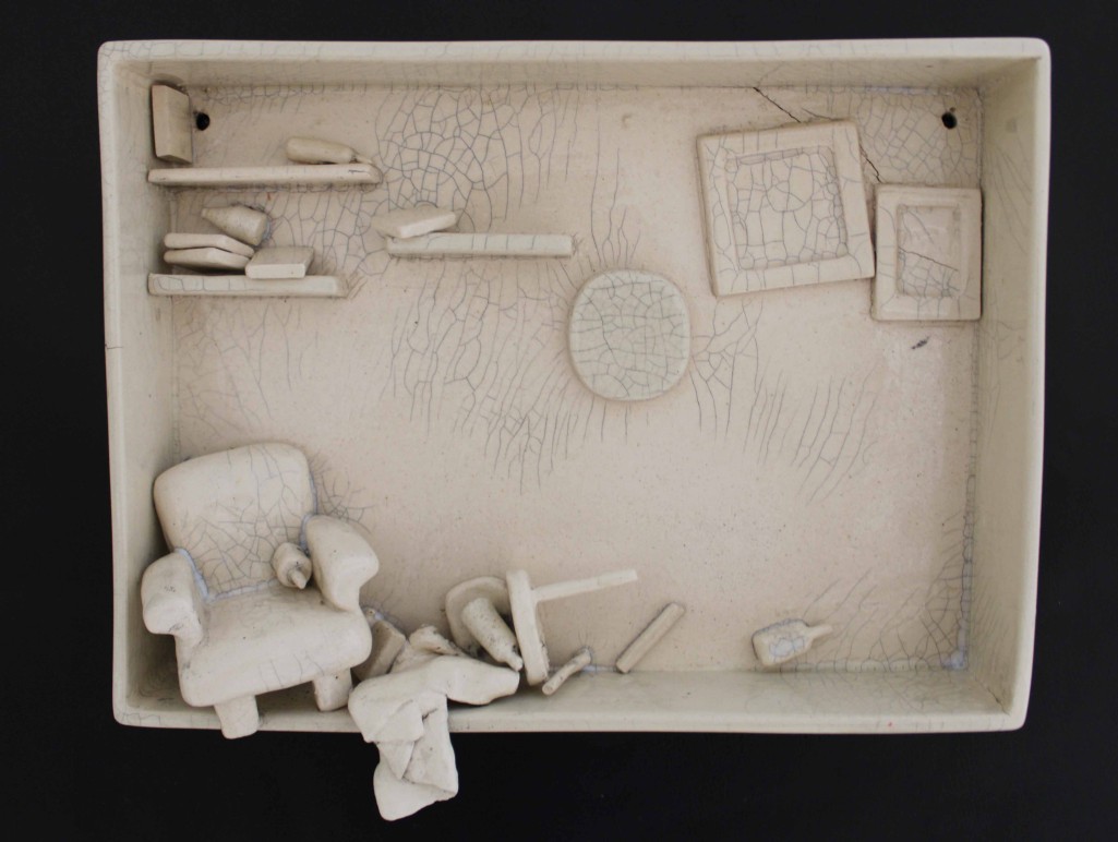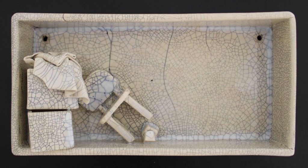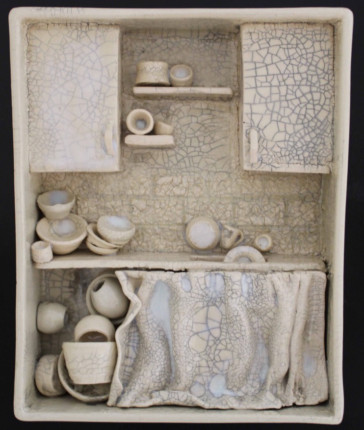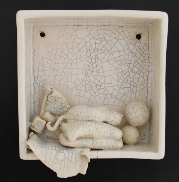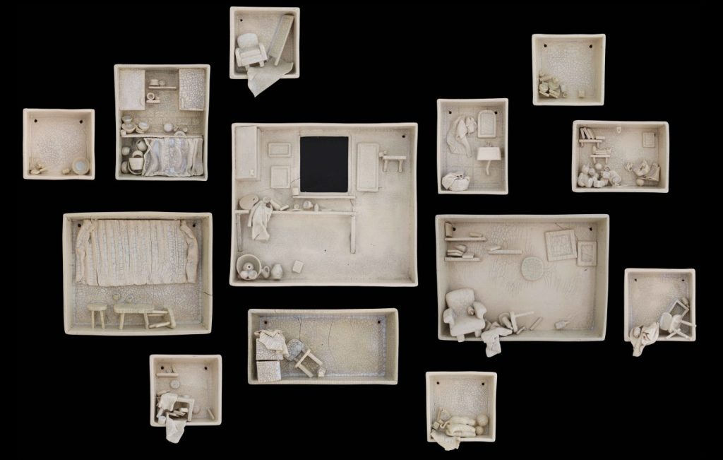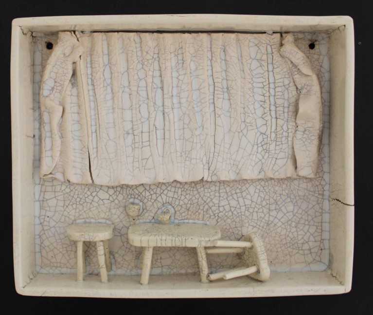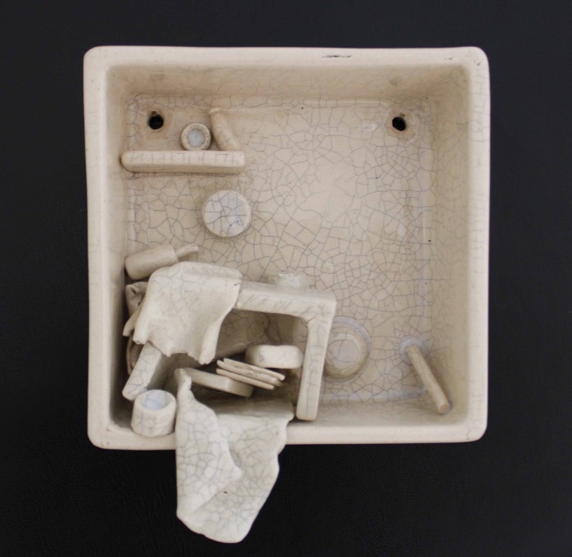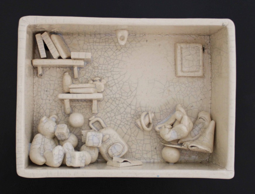 “Sürekli Yarın” isimli çalışma, erteleme eğiliminin ve yetersizlik duygusunun bireyde yarattığı kaygıyı ve kişinin kendi iç dünyasında verdiği sürekli, zorlu mücadeleyi ifade eder. Minyatür odalarda yerleştirilmiş küçük objelerin dağınıklığı, kişinin zihninde ve ruhunda yaşanan karmaşayı somutlaştırır; her obje, bireyin içsel çatışmasının ve bastırılmış duygularının sessiz bir göstergesidir. Üzerini kaplayan krakle sır, artık bu duyguların yalnızca içte kalmadığını, sınırlarını aşarak dış dünyaya taşındığını simgeler.
