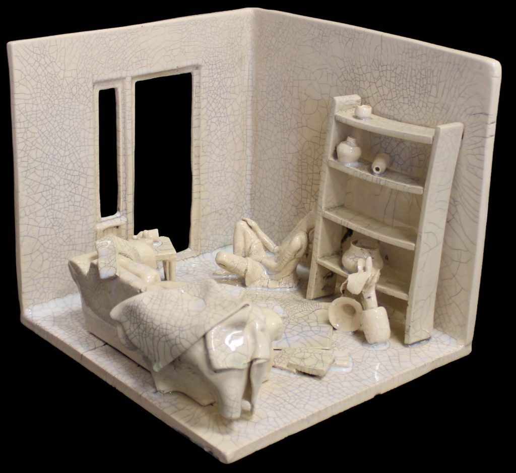 “Sürekli Yarın” isimli çalışma, erteleme eğiliminin ve yetersizlik duygusunun bireyde yarattığı kaygıyı ve kişinin kendi iç dünyasında verdiği sürekli, zorlu mücadeleyi ifade eder. Minyatür odalarda yerleştirilmiş küçük objelerin dağınıklığı, kişinin zihninde ve ruhunda yaşanan karmaşayı somutlaştırır; her obje, bireyin içsel çatışmasının ve bastırılmış duygularının sessiz bir göstergesidir. Üzerini kaplayan krakle sır, artık bu duyguların yalnızca içte kalmadığını, sınırlarını aşarak dış dünyaya taşındığını simgeler.
