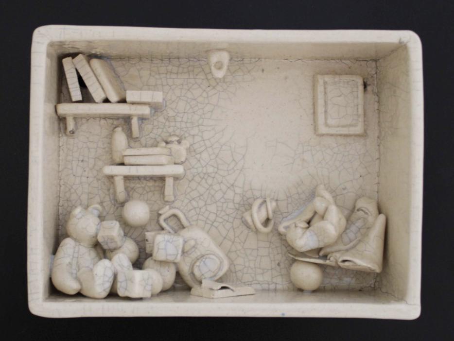“Sürekli Yarın” isimli çalışma, erteleme eğiliminin ve yetersizlik duygusunun bireyde yarattığı kaygıyı ve kişinin kendi iç dünyasında verdiği sürekli, zorlu mücadeleyi ifade eder. Minyatür odalarda yerleştirilmiş küçük objelerin dağınıklığı, kişinin zihninde ve ruhunda yaşanan karmaşayı somutlaştırır; her obje, bireyin içsel çatışmasının ve bastırılmış duygularının sessiz bir göstergesidir. Üzerini kaplayan krakle sır, artık bu duyguların yalnızca içte kalmadığını, sınırlarını aşarak dış dünyaya taşındığını simgeler.