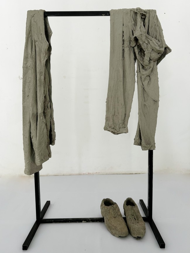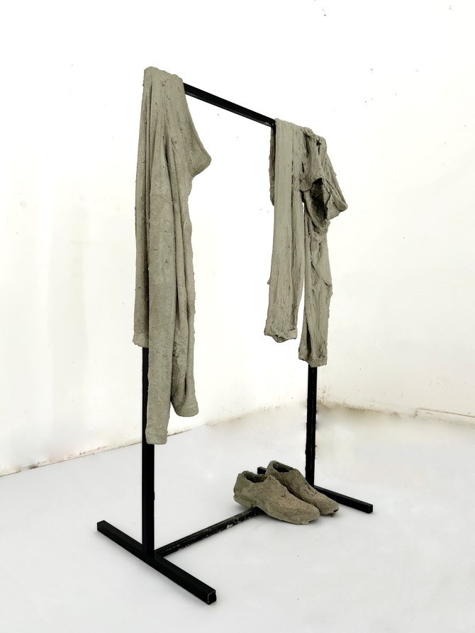 Objects placed on a hanger and covered with concrete produce a solid and heavy response against the rapid consumption and obsolescence of the everyday. Here, concrete suspends the function of the object; it removes it from usability and renders it visible only as a remnant. The work brings into question how social memory freezes and how the ordinary leaves a trace at the point where transience collides with permanence. This stagnation makes visible the repetitions oscillating between forgetting and remembering, both on an individual and collective level; a motion without exit, like the burden being carried anew each time.