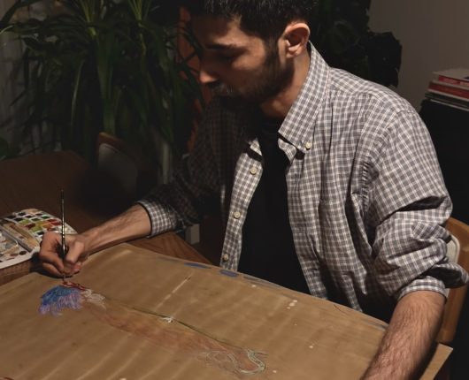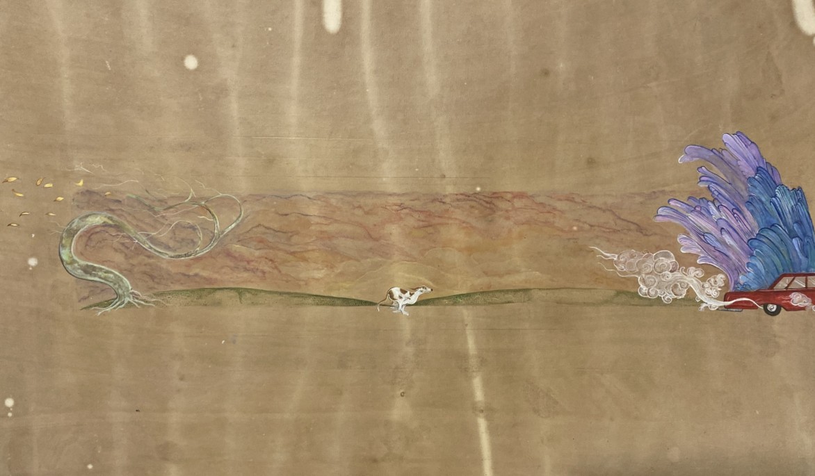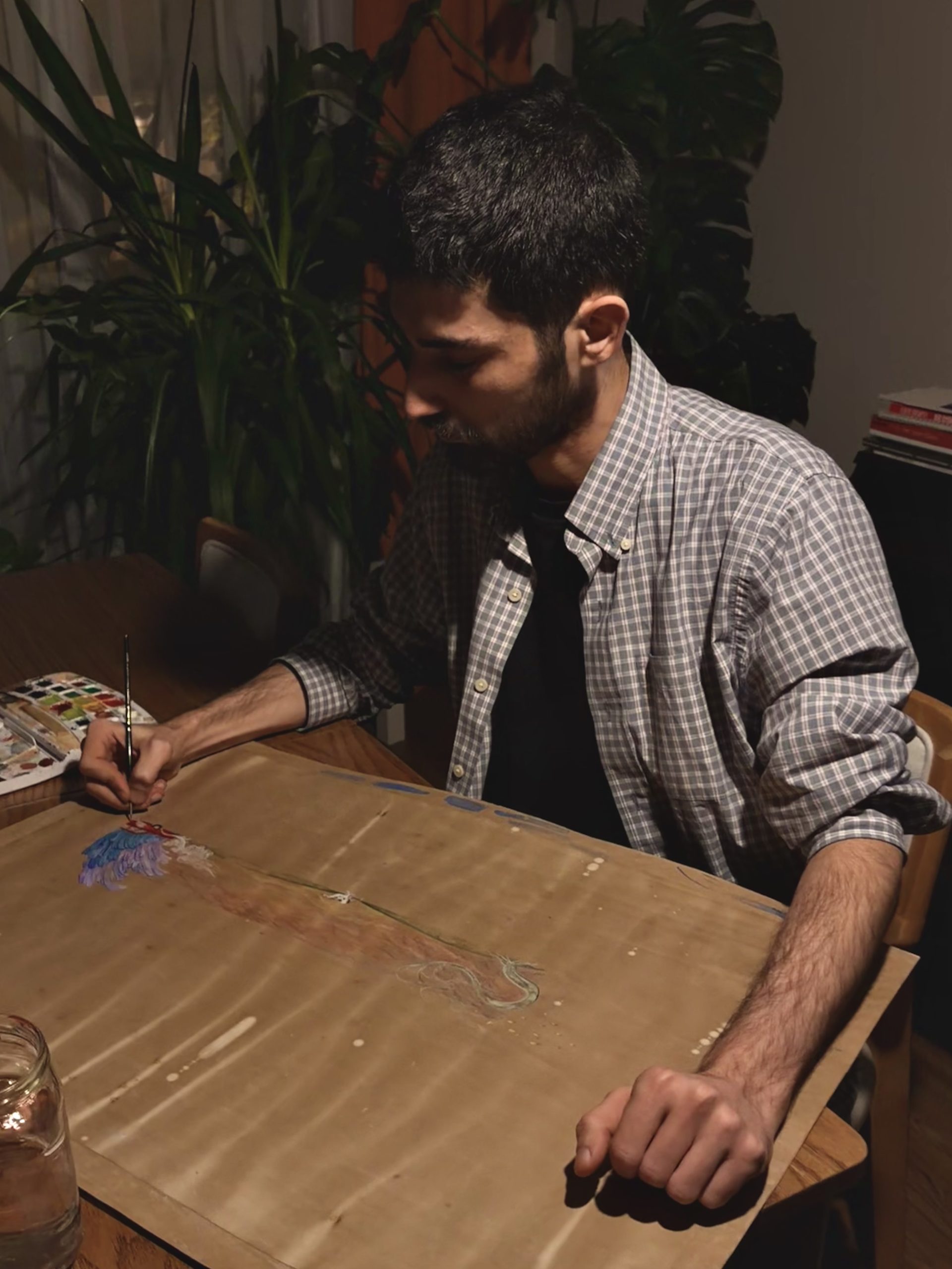 On Muraqqa; natural pigments, watercolor, gouache, acrylic paint, gold, 35×70 cm