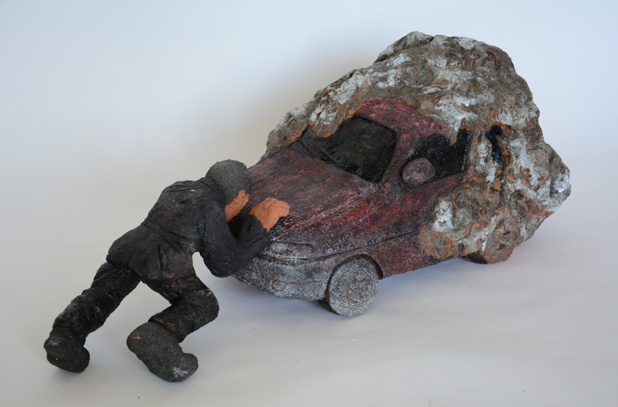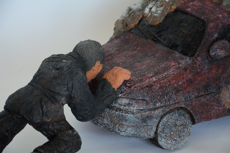Tork, hareketin anlamını yitirdiği noktada, bireyin farkında olmadan kendi döngüsünde sıkışıp kaldığı bir anı simgeler. Araba, artık ilerleyen bir nesne olmaktan çıkar ve zaman ile çabanın ağırlığı altında hareketsiz bir kütleye dönüşür. Figür, tüm gücüyle bu kütleyi geriye doğru iterken, herhangi bir ilerleme kaydetmediğinin bilincinde değildir. Bu yönsüz çaba, modern bireyin günlük rutinlerinde farkındalığını yitirmiş hareketlerini anımsatır. Mücadele, anlam arayışından ziyade, alışkanlığın ivmesiyle sürdürülen bir eyleme dönüşmektedir. Sisifos’un kayası gibi, bu kütle hem direnişi hem de bilinçsiz teslimiyeti temsil eder. Tork, bu döngüde kaybolmuş bireyin, hareket içinde durağanlaşan bilincine ve kayaya rağmen devam etme durumuna atıfta bulunur.