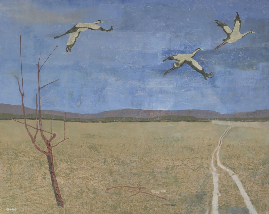 The crane metaphor, frequently used in Turkish folk music, became a visual image with this painting. The painting, titled “Türküye Benzer”, is designed to evoke the metaphorical and mythological story of cranes in a setting reminiscent of the countryside.