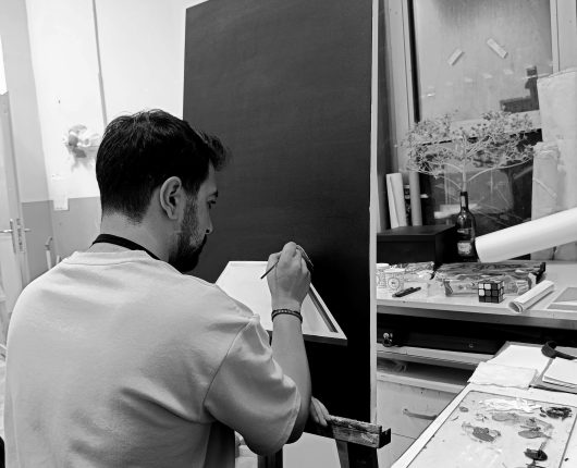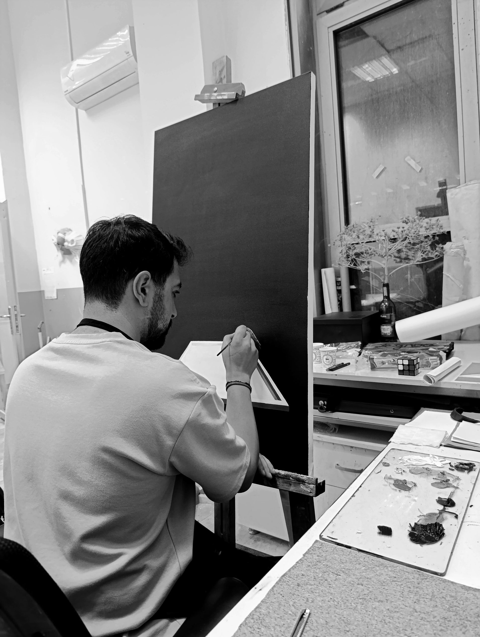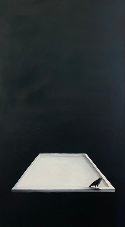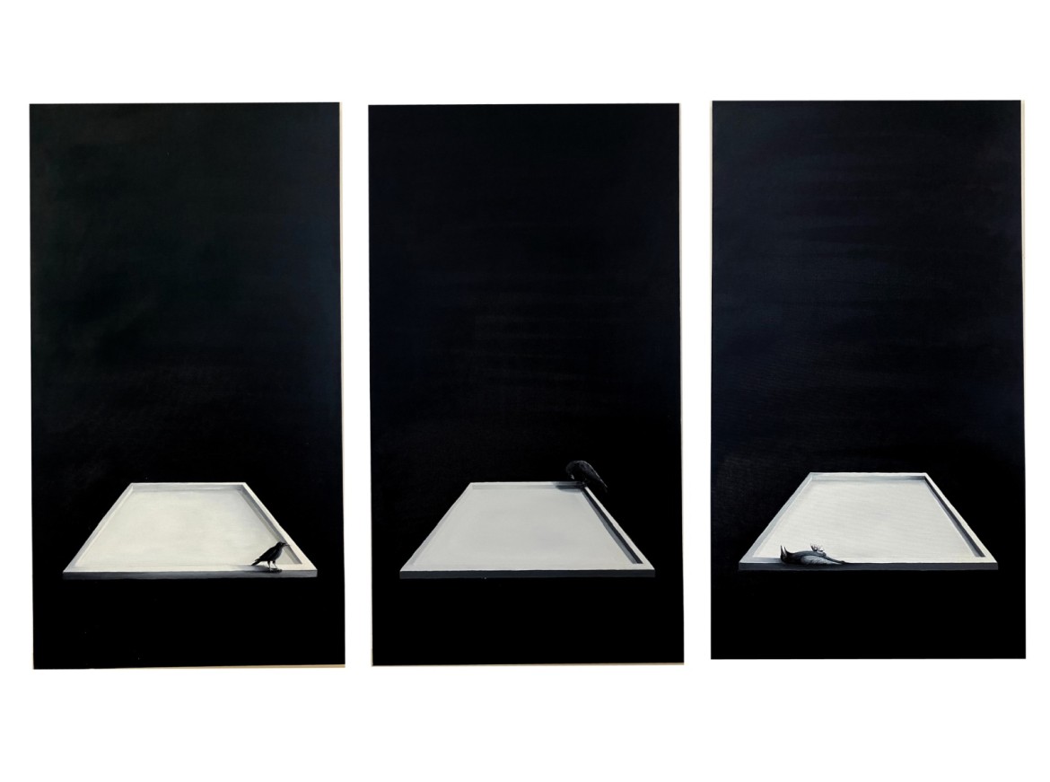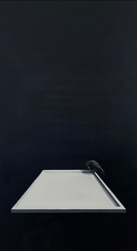 In my work, I see the crow as a mirror of the self. Through history, people have seen crows in many ways—sometimes as bad luck, sometimes as wisdom, sometimes as darkness, sometimes as a guide. That mix of meanings makes the crow a strong symbol for how complex we are as people. With the crow’s double side, I explore how we see ourselves, how we live with society, and how we face what’s hidden inside us. Once it moves beyond the canvas, the crow isn’t just a bird anymore—it becomes the broken faces of identity, hidden desires, twisted images, and the voice of our inner thoughts. Keeping the crow stuck in one shape feels like keeping a person stuck in a box. If you only stay with one thought and never step outside, you trap yourself. So I ask, should my painting stay inside a frame, or should it break free and take on many shapes, always changing? Inside the frame, the crows are never still. They move, looking for limits, and trying to cross them. Sometimes they gather like a flock searching for home, sometimes they stand alone in an empty room. This journey is not only the crow’s,it’s also mine, searching through the crow’s role.