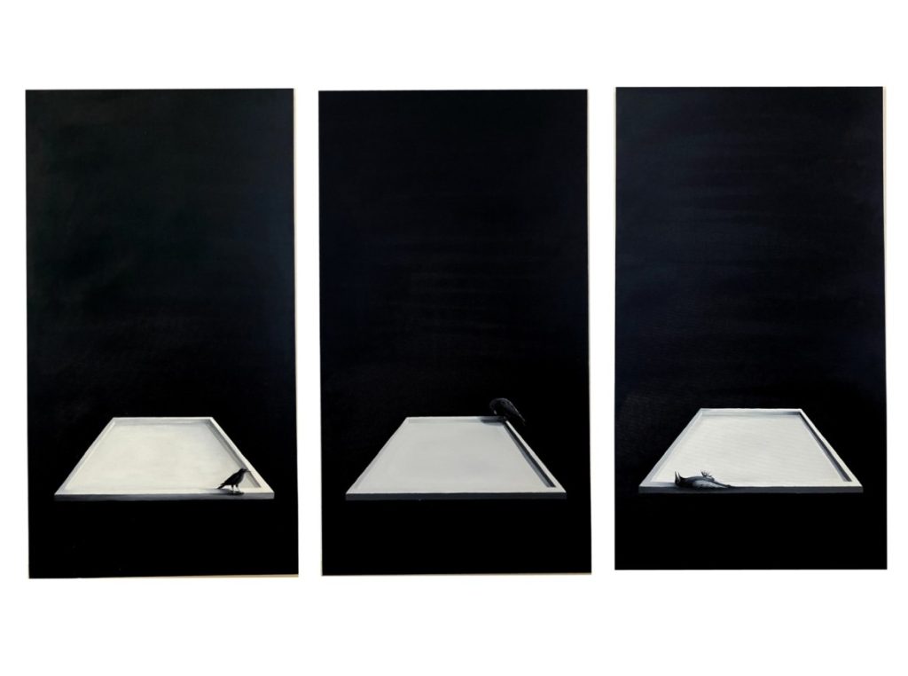 Kargaları benlik algısı içerisinde bir kalıp içinde duruşu onları varoluşsal imkanını kısıtlar, tıpkı bir insan gibi kalıplara sığdırmak, tek düşünceden yola çıkmak ve bu düşünlerinin dışına çıkmamak. Benim resmim sadece bir tuval yani bir kalıba mı sığmalı ya da kalıpları yok sayacak ve her kalıpta kendine rastlanacak bir kalıp dışılığı mı olmalı. Yapılan çerçeve içerisinde kargaların konumları sürekli değişir bir sınır arayıp o sınırı aşmaya çalışıyorum. Karga kimi zaman sürü halinde bir yurt arayışında, kimi zaman yalnız bir odada tek başına. Bi süreç hem karganın hemen de karga rolünde benim bir arayışım.