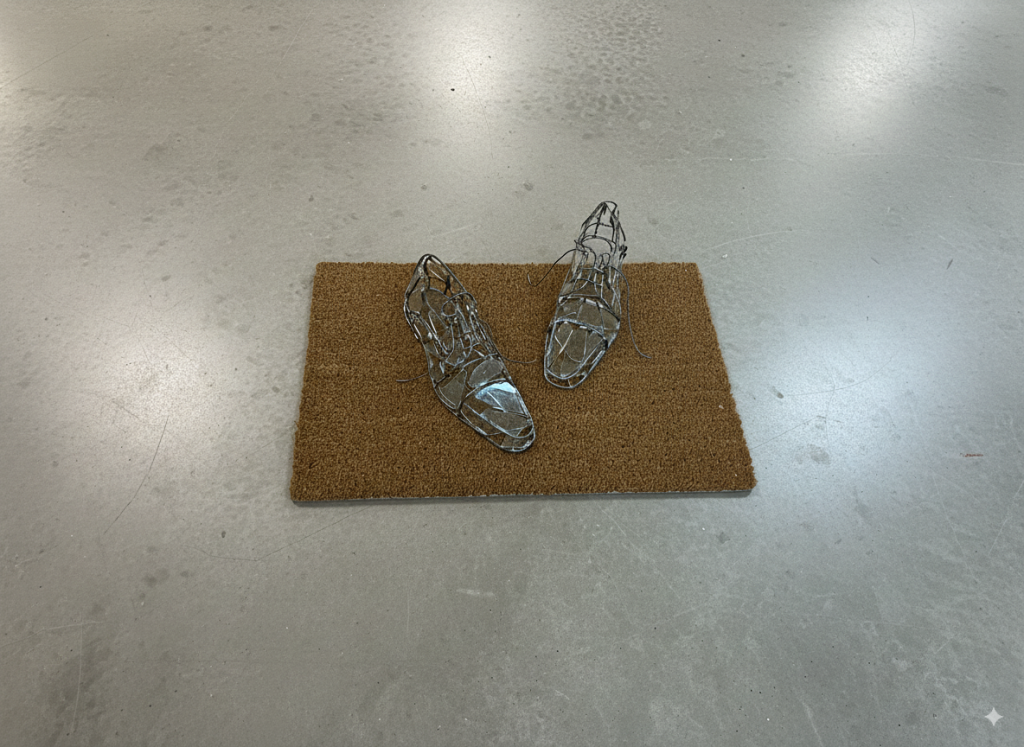 Kırık cam ve bakır tel ile üretilen boş ayakkabılar, paspas üzerinde sanki yeni çıkarılmış gibi durur. Ancak kırılgan yapıları, içeride gerçekten biri olup olmadığını sorgulatır. Çalışma, varla yok arasında salınan baba figürünü ve güvenlik arayışını görünür kılar.