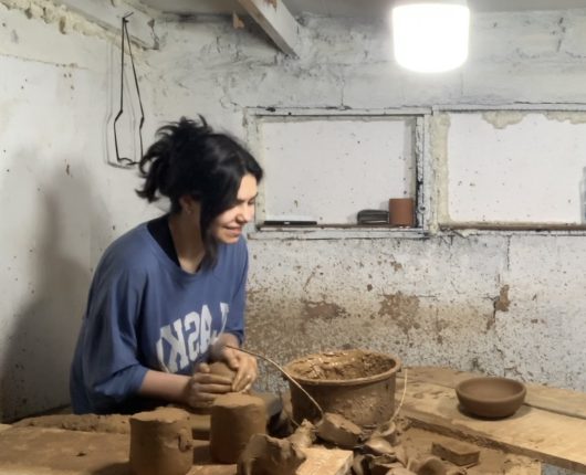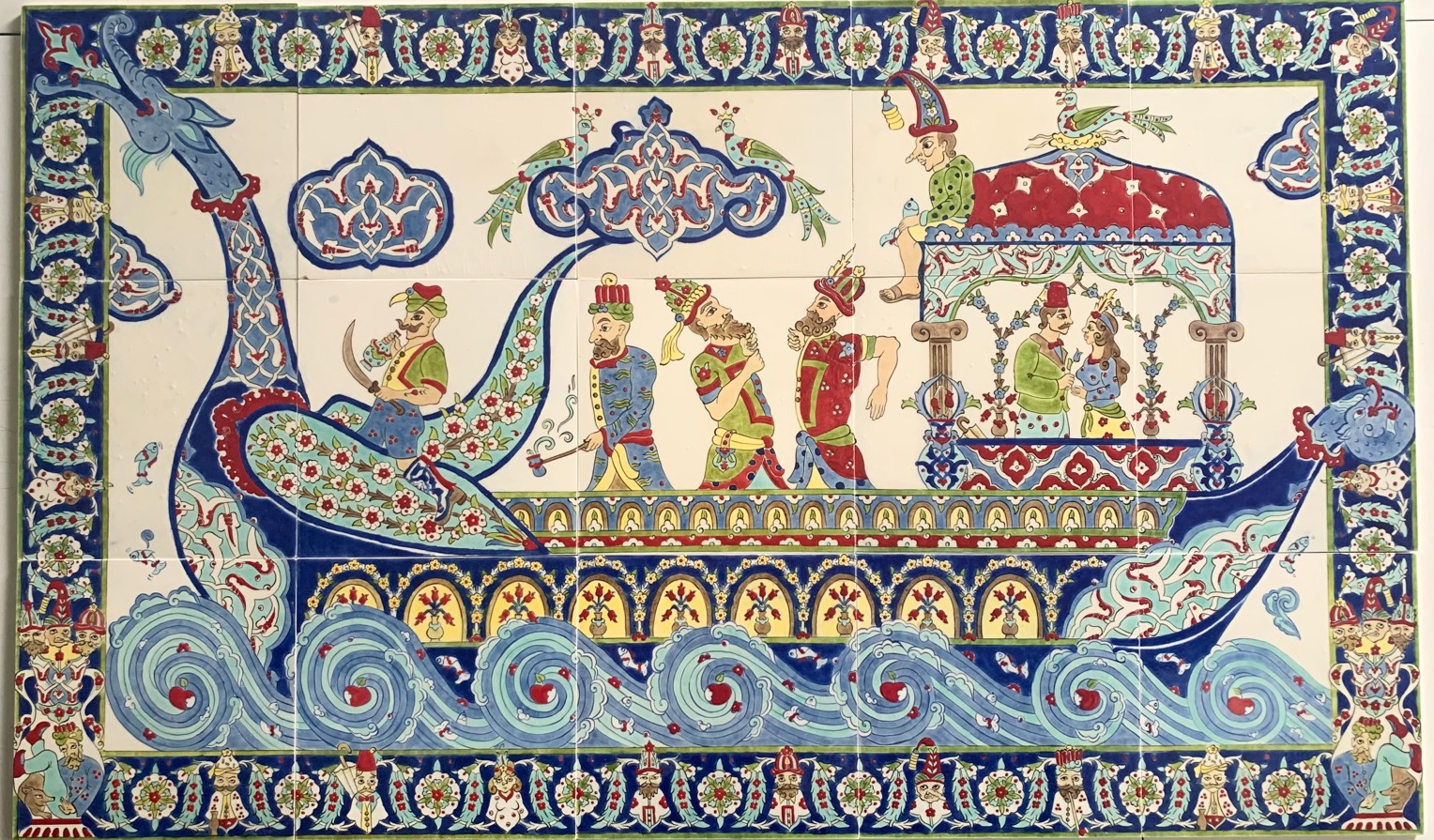 Yalova Sefası, a tile panel inspired by the classical text of the Karagöz shadow play, reinterprets Kütahya ceramic motifs, figures, and ornamentation. The joyful journey of Zenne and Çelebi, along with Karagöz and other characters hidden in a large ceramic vessel, is depicted through this iconic scene. The work aims to merge traditional narrative with a contemporary perspective.