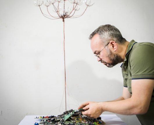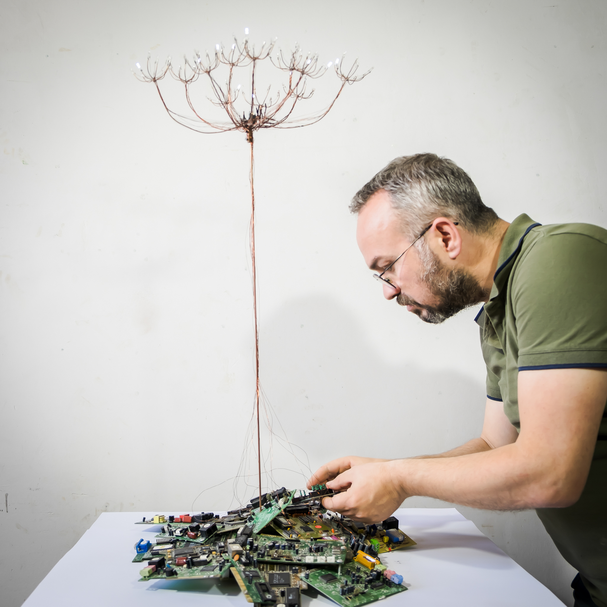 Interactive Sculpture, branch, discarded electronic boards, copper wires, LEDs, Arduino, coding, 140x70x70 cm