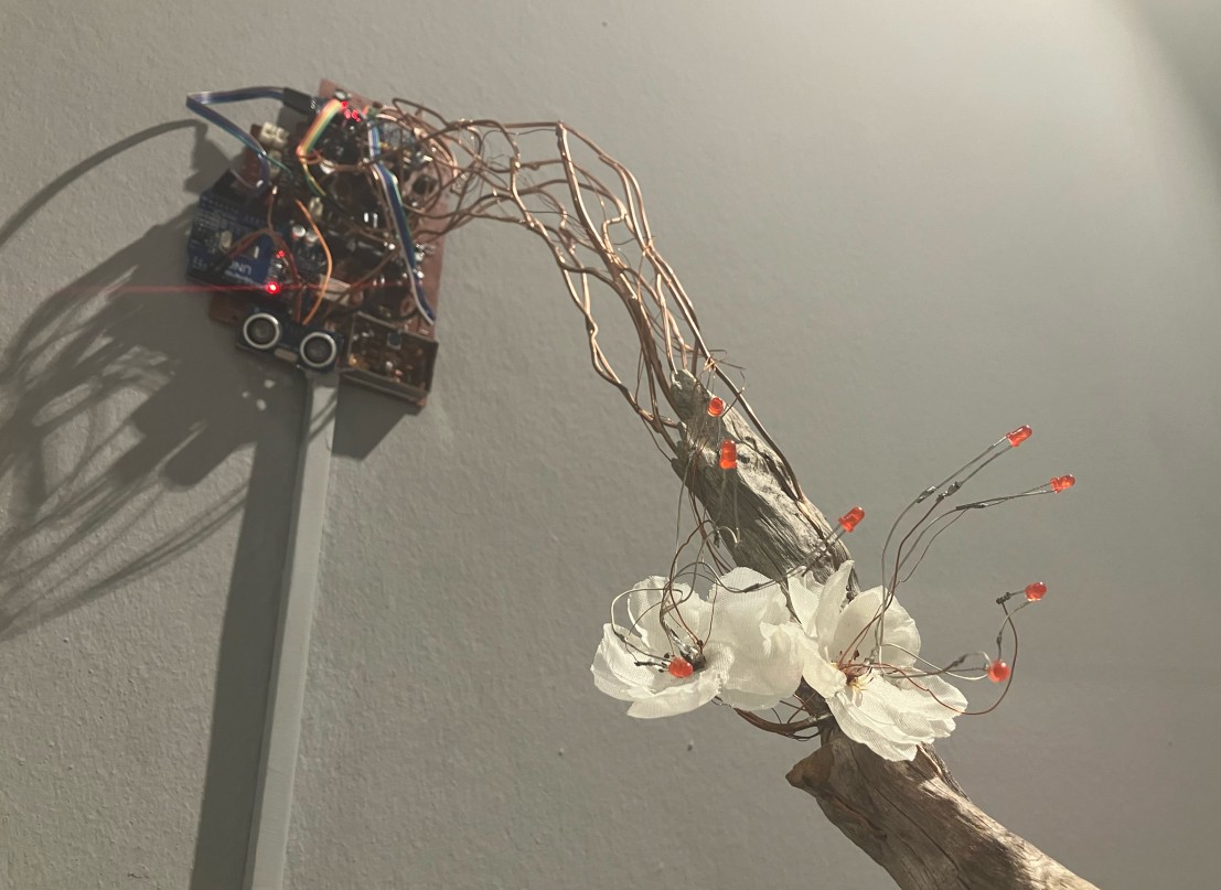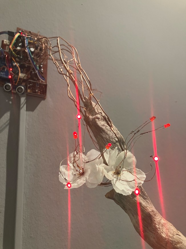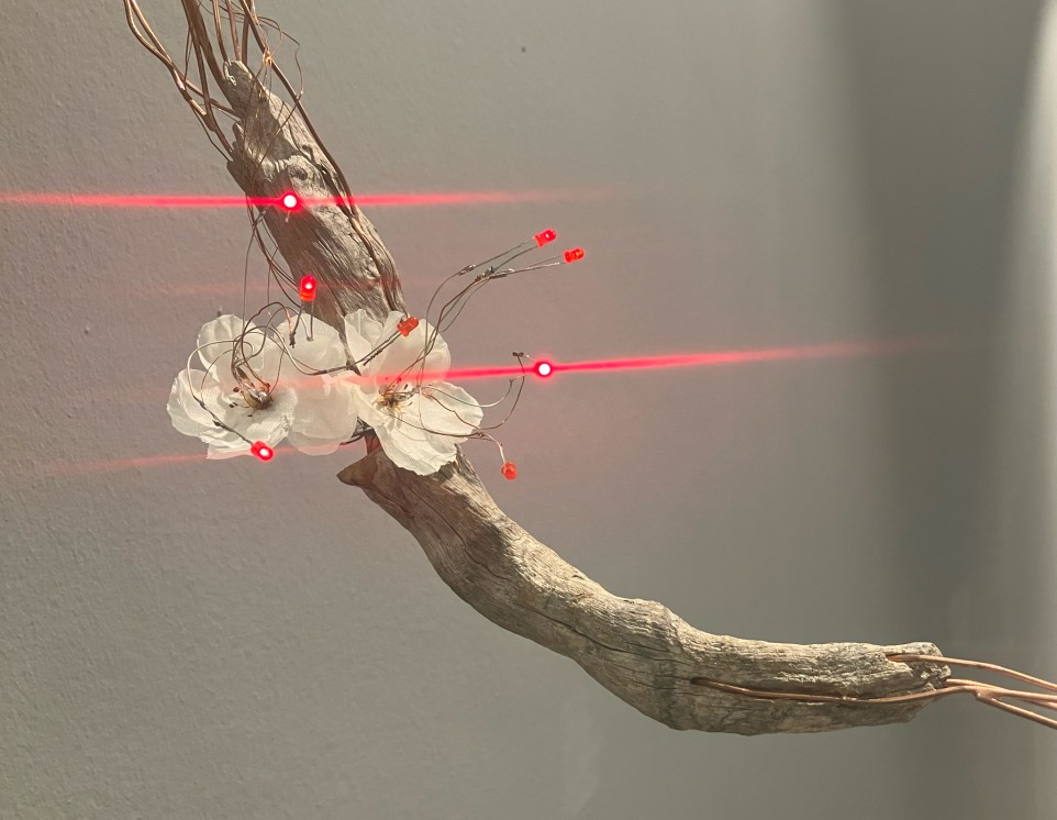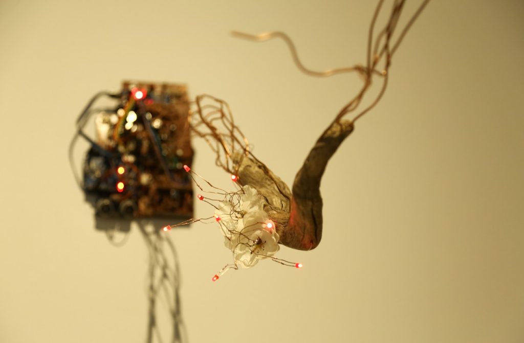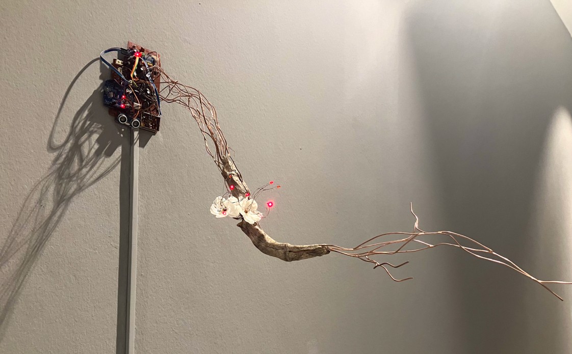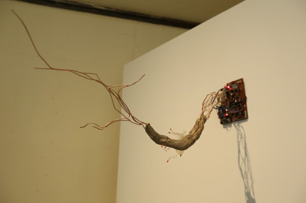 Etkileşimli Heykel, ağaç dalı, atık elektronik kart, bakır teller, ledler, arduino, kodlama, 140x70x70 cm