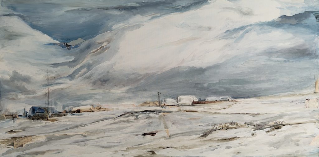 İlk bakışta sakin bir bütünlük sunan bu peyzaj, müdahalelerle yeni okumalara açılır. Tıpkı kar örtüsünün altındakileri gizlemesi gibi, boya katmanlarının arasına gündelik hayattan koparılmış küçük metin parçaları ve çizgisel işaretler yerleştirdim. Detaylar, yanına yaklaşmadan algılanamayan, ancak fark edildiklerinde yüzeyi çatlatan, çarpıtan plastik bir oyun ile ortaya çıkar.