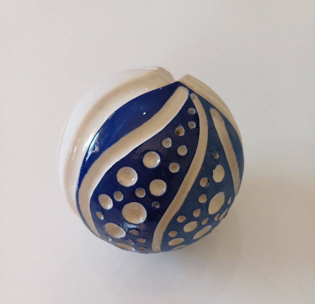 Seramik stonewear, tabak, 34,5×2,5 cm + astar kazıma ve derin oyma tekniği, küre 8,5 Ø cm